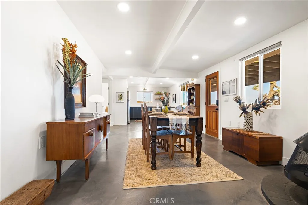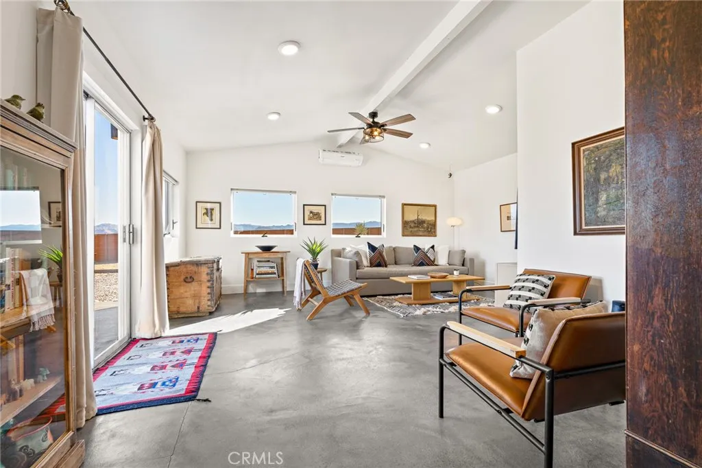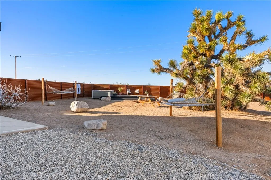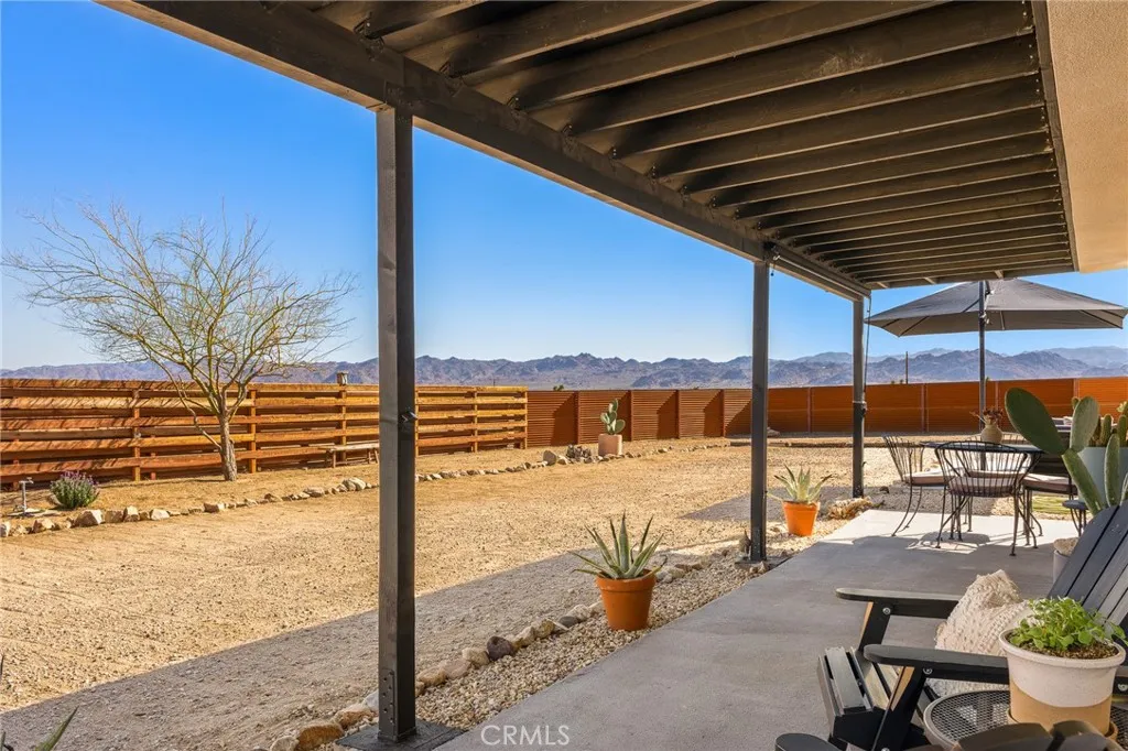 Exceptional Joshua Tree property offering 2.5 total acres comprised of two separate legal 1.25-acre parcels, sold together. Located just off a paved road and only minutes from Joshua Tree National Park, this property combines privacy, convenience, and long-term flexibility. The 2-bedroom, 1-bath home features an open-concept layout with seamless flow between the living, dining, and kitchen areas. Polished concrete floors run throughout, creating a clean, modern desert aesthetic. The dining space is anchored by a statement Malm fireplace, adding warmth and architectural character. The kitchen includes a Bertazzoni induction range, blending high-end performance with modern design. Mini-split systems throughout the home provide efficient heating and cooling year-round and stacked washer and dryer. The shaded front porch offers comfortable outdoor living during the summer months. In the rear, an oversized deck with a large hot tub captures expansive 360-degree desert and National Park views. The privacy of the acreage combined with Joshua Trees dark skies makes this an ideal setting for stargazing, entertaining, and quiet desert living. One of the parcels is fully fenced and accessed through a solar-powered electric gate. Mature desert landscaping, including established Joshua Trees, enhances the setting while preserving open desert surroundings. The property is connected to city water, adding everyday convenience and long-term value. A separate detached garage provides additional storage and presents potential for conversion into an ADU or guest house (buyer to verify with cou