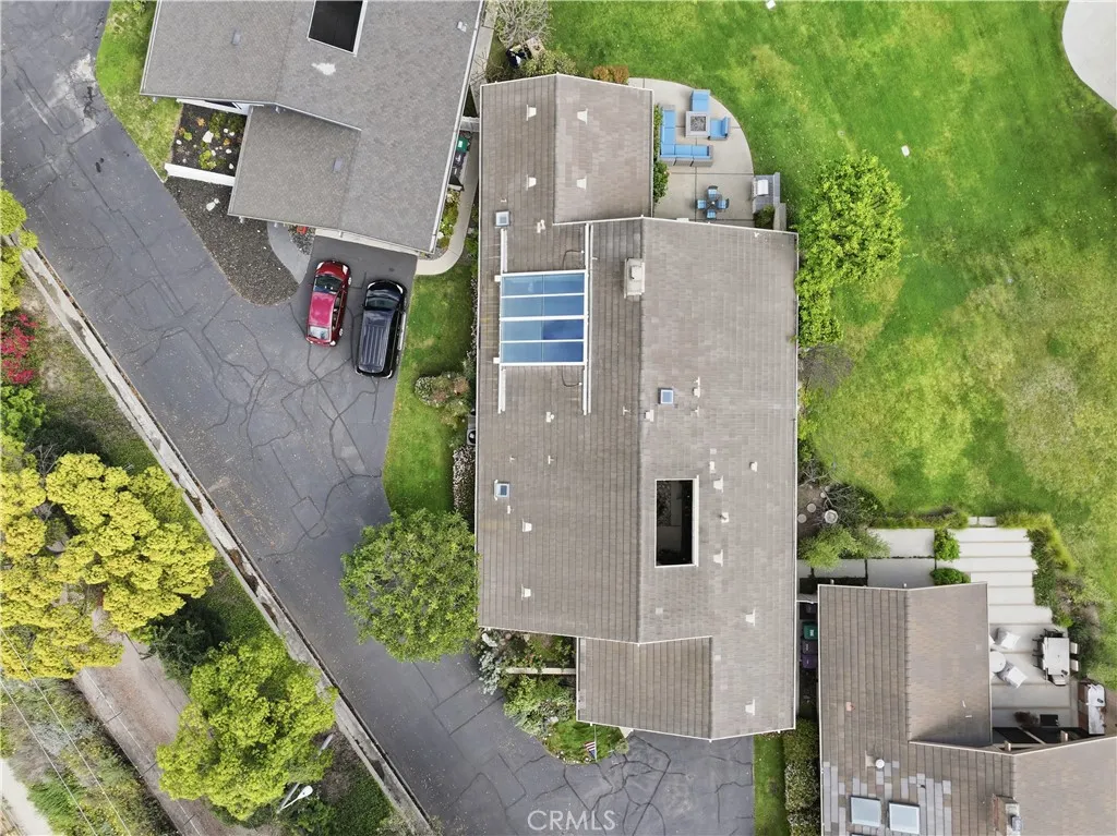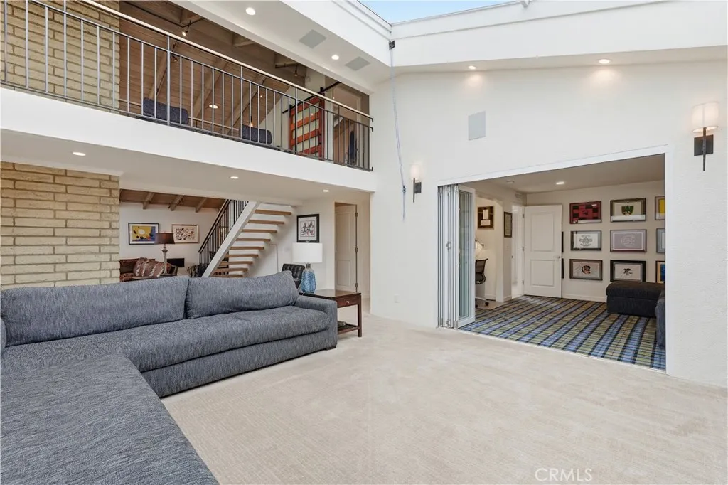 Tucked behind gates in the prestigious Virginia Country Club area of Los Cerritos, this stunning Mid-Century Modern retreat blends architectural character with thoughtful modern upgrades and golf course views. A private atrium welcomes you at the front entry, creating a tranquil first impression with fountains and greenery. The home offers a serene backdrop of lush grass, a community pool and in the distance the 14th fairway of Virginia Country Club, creating a rare sense of privacy and tranquility. Inside, walls of glass and multiple skylights flood the home with natural light, enhancing the open, airy design. The showpiece media room features a retractable roof, allowing you to open the space to the sky and enjoy the sound of birds and trees blowing in the wind - an extraordinary indoor-outdoor living experience. The gourmet kitchen is equipped with top-of-the-line appliances, sleek cabinetry and premium finishes, ideal for both everyday living and effortless entertaining. The living room shows off her fireplace and offers a warm and cozy retreat with sliding glass doors that open directly to the backyard, creating another indoor-outdoor setting perfect for relaxing evenings around your firepit or gatherings with friends at the built-in BBQ. A unique architectural highlight is the converted attic, thoughtfully transformed into an upstairs living space featuring an additional en-suite bedroom and bath. This level also includes a second viewing area overlooking the media room below, adding both flexibility and a striking architectural perspective. The 3082sqft floorplan boa