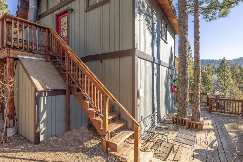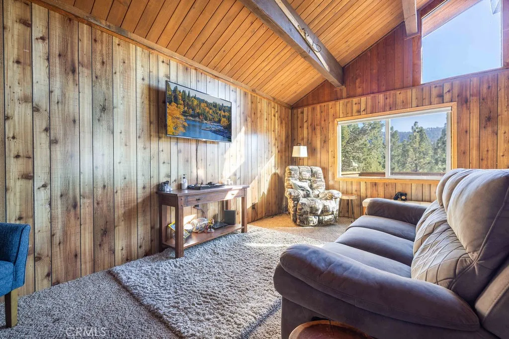 Prime Moonridge location with a south-facing orientation and easy access to the paved pathway, Bear Mountain Ski Resort, the golf course, Alpine Zoo, scenic forest hiking and biking trails, plus local favorites like Moonridge Coffee and Dank Donuts. This stylish mountain home delivers both lifestyle and convenience. The reverse floor plan places the main living space upstairs, where vaulted wood-beamed ceilings and expansive windows bring in natural light and capture mountain and treetop views. A striking rock fireplace anchors the living room, while the kitchen and dining area flow comfortably for everyday living or hosting guests. A balcony just off the living and dining space extends entertaining outdoors and benefits from consistent sunshine throughout the day, along with easier winter snow melt thanks to the south-facing orientation. A bathroom is also conveniently located on this upper level. Downstairs, both bedrooms, a second bathroom, and laundry are positioned off the entry level, offering privacy and functionality. A dedicated mudroom with direct backyard access adds everyday practicality, and additional access from upstairs enhances indoor and outdoor flow. Multiple decks, a private hot tub with expansive sky views, and a flat, usable backyard create inviting outdoor space ideal for yard games, entertaining, or relaxing among the pines. Enjoy elevated, treehouse-like views while still benefiting from convenient access and parking. Whether you are searching for a vacation home, short-term rental investment opportunity, or full-time mountain residence, this proper