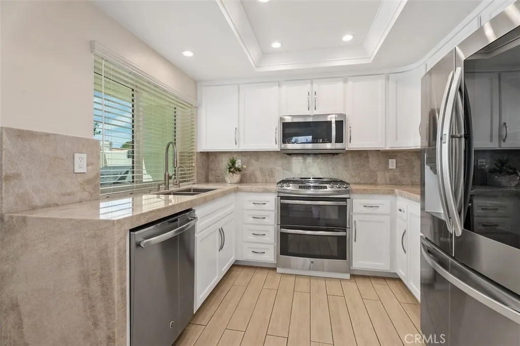 Completely remodeled and turnkey, this 3-bedroom, 2.5-bathroom, 1,601 sq. ft. home is located in the private gated community of Bayview Terrace. Set within a private compound, the residence features custom paint, molding, floorboards, triple-pane windows, wood shutters, LED lighting, porcelain tile flooring throughout, and a Quartzite stone fireplace. The gourmet kitchen includes stainless steel appliances, premium finishes, and a layout suitable for entertaining. The primary suite features new window shutters and LED lighting. The spa-inspired primary bath includes Quartzite counters, a full Quartzite slab shower with bench, Toto toilet, porcelain tile, built-in vanity with lighting, custom closet doors, and a cabinet above the vanity. Secondary bedrooms include new windows, wood shutters, mirrored closet doors, and porcelain tile flooring. One bedroom has a chandelier and custom closet drawer setup; the other offers updated finishes and natural light. Additional features include hidden under-stair storage, internet readiness, newer water heater, custom landscaping, and an outdoor area with porcelain hardscaping that matches the interior and an outdoor TV. The two-car garage features epoxy floors, cabinets, and a new garage door opener. Community amenities include a pool, spa, and tennis courts. The home is located near Fashion Island, beaches, scenic trails, and top-rated schools.