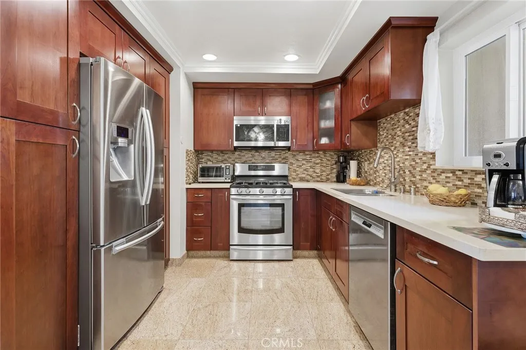Meticulously cared for and highly upgraded single level Sherman Oaks condo on the border of Studio City featuring 3 private patios, in-unit laundry, and two gated parking spots. The unit is privately situated in the very back of the complex making it the ideal quiet location away from street noise. Step inside to find a formal entry foyer that opens to a spacious living room that features a gas fireplace, glass slider that opens to a scenic balcony, and real hardwood floors found throughout. Separate formal dining room has direct kitchen access and a glass slider that opens to another balcony that overlooks the interior courtyard. The upgraded kitchen has quartz counters, stainless appliances, custom cabinetry with pullout pantry drawers, and tiled backsplash. The oversized primary suite features a glass slider that opens to a third scenic balcony, a sprawling walk-in closet with built-ins, and a private en-suite bathroom with quartz counters, dual sinks, and spa tub with jets and shower. The second bedroom is also well appointed with access to an upgraded hall bathroom with walk-in shower, also ideal for guest powder bathroom. Laundry is conveniently located in the unit with side-by-side washer & dryer. The community features swimming pool, recreational room, guest parking, and private gated access with lobby. Situated just one block away from award-winning Dixie Canyon Elementary, two blocks from Ventura Boulevard shops and restaurants, and easy access to freeways as well as both Coldwater & Laurel Canyons. The HOA fee also includes water & trash costs plus pest control.