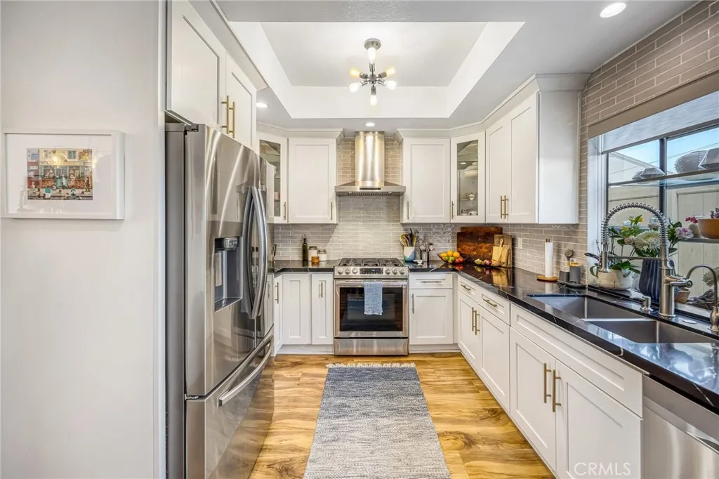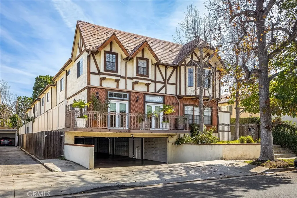 Completely reimagined and turnkey, this sophisticated two-story townhome in an intimate 8-unit Tudor-style enclave offers elevated living in prime Sherman Oaks with no one above or below you for ultimate privacy. Enter through a secure gated walkway or private direct-access two-car garage into a dramatic, light-filled living space featuring wide-plank flooring, a gas fireplace, and an elegant wet bar with marble countersideal for entertaining. The open dining area flows to a private rear patio, while a second front patio provides additional outdoor space for relaxing or hosting. The fully remodeled kitchen showcases custom cabinetry, quartz countertops, stainless steel appliances, a breakfast area, and convenient side-by-side laundry. A brand-new central air system ensures year-round comfort. Upstairs, both bedrooms feature their own ensuite baths. The spacious primary suite offers vaulted ceilings, a gas fireplace, and abundant natural light. The spa-inspired primary bath highlights marble tile and counters, dual vanities, soaking tub, separate shower, and a generous walk-in closet. The secondary suite is well-sized with its own remodeled bath. Low HOA dues include water, sewer, trash, common area maintenance, and earthquake insurance. Walking distance to Ventura Boulevards coffee shops, restaurants, bars, as well as Sportsmen's Lodge, and located within the coveted Dixie Canyon Community Charter School district.