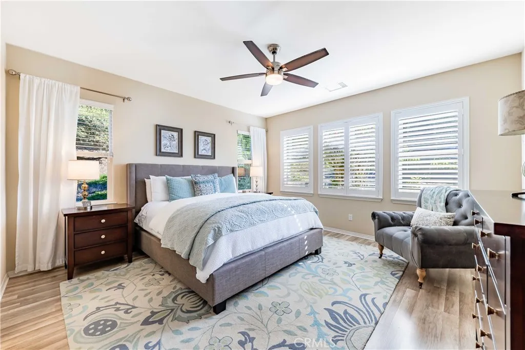 Welcome to your dream home in the highly sought-after Morgan Hill community of Temeculawhere refined design and resort-style living come together seamlessly. This stunning 4-bedroom, 3.5-bath residence spans 3,003 sqft on an expansive 10,890 sqft lot, offering a rare and highly desirable primary suite on the main level. From the moment you arrive, youre greeted by a striking front door with elegant glass inlay and an inviting sitting area. Just off the entry, a spacious secondary downstairs bedroomideal for guests, multi-generational living, or a private officesits adjacent to a beautifully appointed full bath. The main living space is both warm and sophisticated, featuring custom built-in bookshelves, a fireplace, and an abundance of natural light that fills the home through oversized windows. The kitchen is a true showpiece, designed for both everyday living and entertaining, featuring stunning quartzite countertops, a custom ceramic tile backsplash, dual ovens, a large walk-in pantry, updated fixtures throughout, and a beautiful white porcelain drop-in sink that anchors the space. The downstairs primary suite is a private retreat, complete with plantation shutters, ceiling fan, and a spa-inspired bathroom featuring an oversized walk-in shower, soaking tub, dual sinks, and an expansive walk-in closet. Upstairs, youll find generously sized secondary bedrooms, a dual-sink bathroom, and a versatile loft/bonus room enhanced by gorgeous built-in cabinetryperfect for a home office, media room, or additional living space. Step out onto the upper deck and take in breathtaking vie