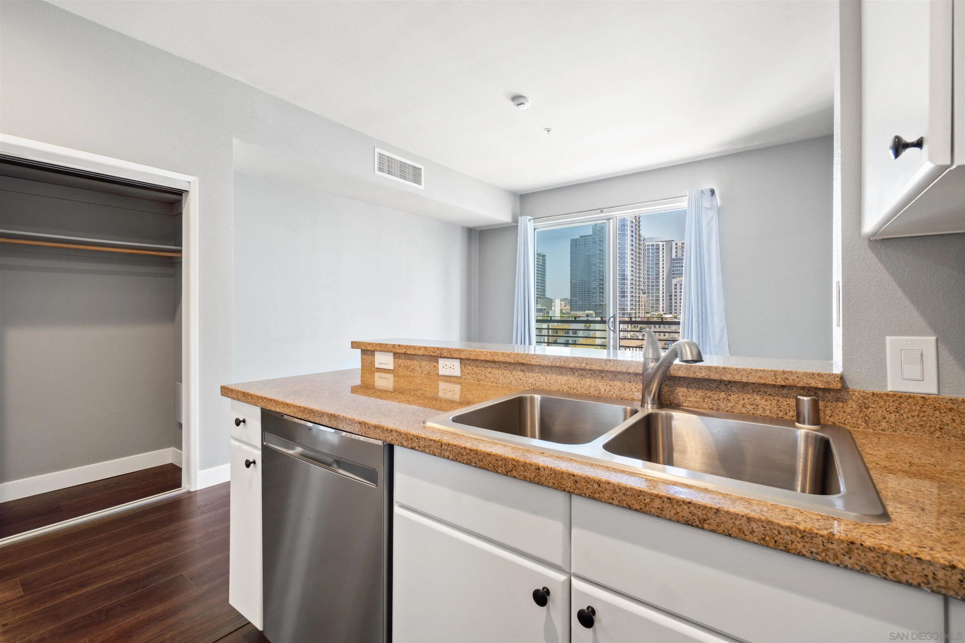 Rarely available, TOP FLOOR, LIGHT, BRIGHT, AIRY, & IMMACULATE studio, 1 bath, 1 parking, in the heart of the Marina/Gaslamp. You will appreciate the abundance of natural light, and the bright, airy vibe throughout this spacious unit. Well-appointed finishes, featuring a chef's kitchen with stainless appliances, and granite countertops, provide the perfect space to whip up culinary delights and entertain guests. Washer/dryer and A/C. WALKING DISTANCE TO EVERYTHING: Petco Park, Little Italy, the Marina, bars, restaurants, boutiques, the train, trolley, airport, freeways, and more. Building features pool, spa, sundeck with built-in gas BBQ. This won't last!