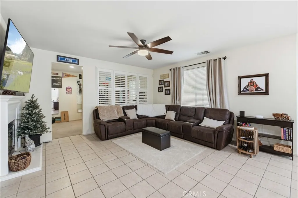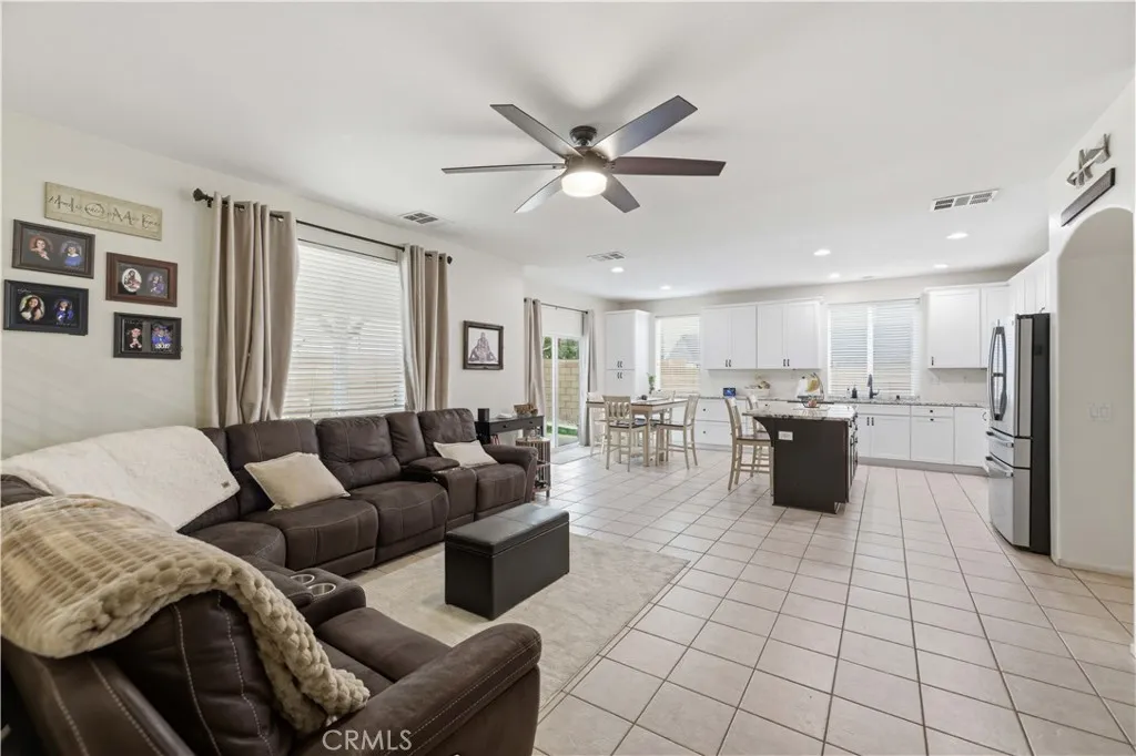 Welcome home to this spacious 2,815 sq. ft. residence offering 4 bedrooms and 3 bathrooms. A beautiful custom front door with a stained-glass window welcomes you into the tiled entryway, where a generously sized, carpeted front living room provides the perfect setting for family gatherings or quiet evenings in. A guest bathroom is conveniently located downstairs for added comfort and accessibility. The heart of the home is the remodeled kitchen, thoughtfully updated with granite countertops, crisp white cabinetry, a center island, black faucet, and modern black hardware. Extended countertop space and added pantry storage enhance both style and function. The kitchen features tile flooring, which continues seamlessly into the dining area and the open family room. The family room offers a warm and inviting atmosphere with its cozy fireplace. Just off this space is a separate bonus room, currently used as a gym, but easily converted into a 5th bedroom, office, or playroom depending on your needs. Upstairs, the oversized primary bedroom provides a true retreat. It features two walk-in closets that lead into the spacious primary bathroom complete with a soaking tub and glass-enclosed shower. Three additional upstairs bedrooms offer generous space, including one with its own private alcove or sitting area--perfect for reading, studying, or relaxing. All bedrooms are equipped with ceiling fans, and the laundry room is conveniently located upstairs. The backyard is expansive and professionally landscaped, featuring a covered patio, two grass areas, and attractive concrete curbing--i