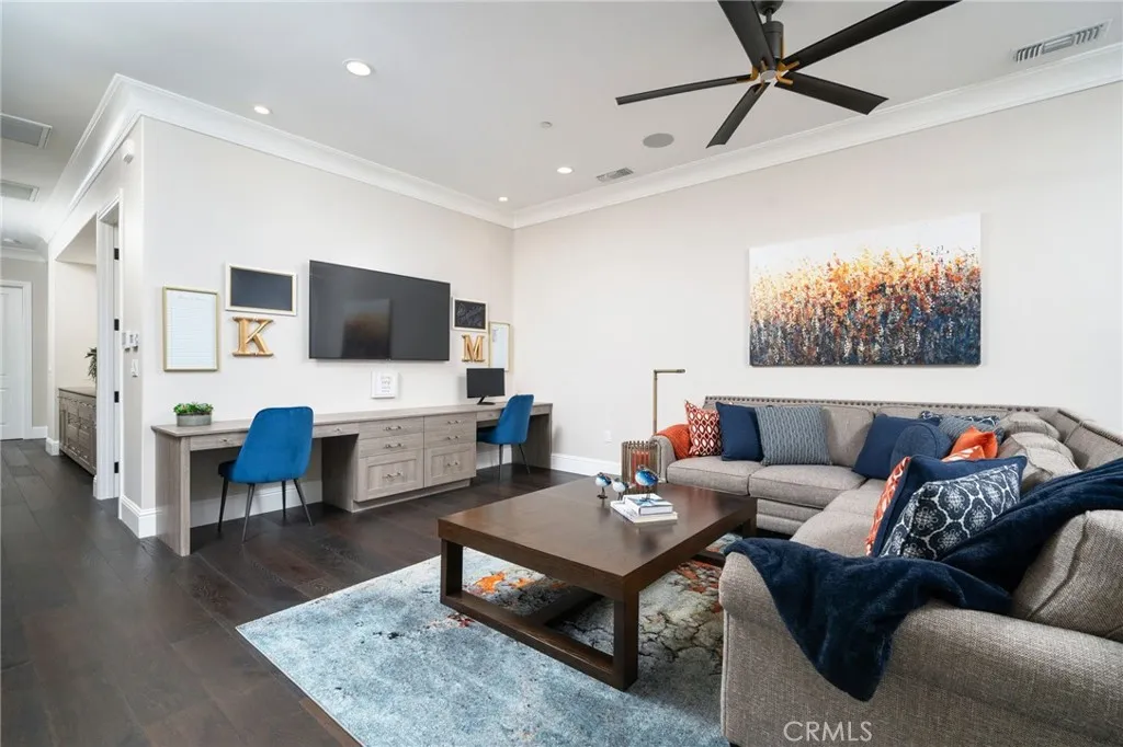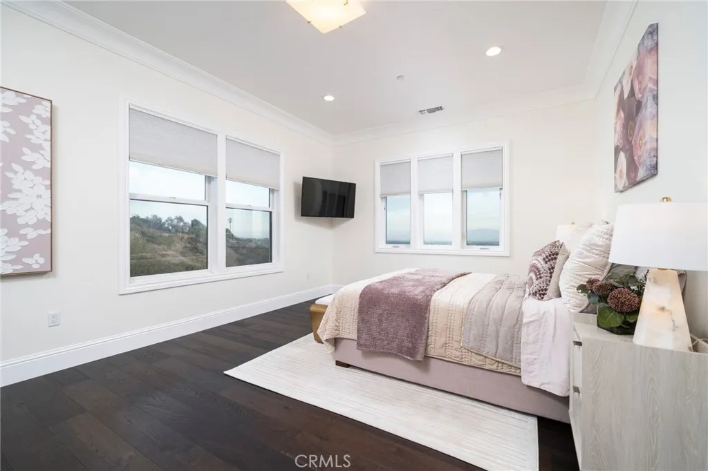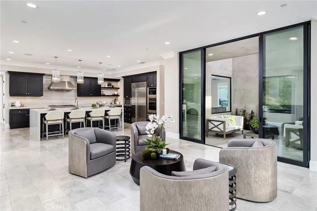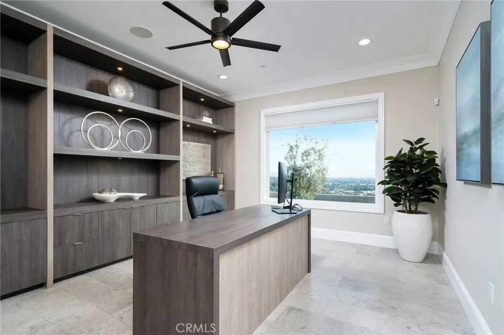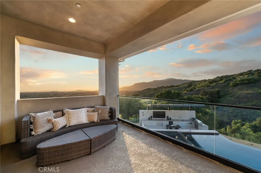 Nestled in the exclusive, gated community of Saddleback Crest Estates, this 2019 custom-built estate offers the ultimate in privacy, luxury, and breathtaking views. Perched high on a hillside, the home boasts panoramic vistas of downtown Los Angeles, the San Gabriel Valley, and the surrounding mountains. As you step through the double door entry, you're welcomed into a grand formal entry and living room featuring soaring 2-story ceilings, a beautiful fireplace, a dramatic spiral iron staircase, and incredible views. The family/great room is designed for seamless indoor-outdoor living, w/37 retractable glass doors framing the spectacular city lights & pool views. A cozy gas fireplace, glass-enclosed courtyard w/a soothing fountain, and a spacious seating area create an atmosphere of relaxation and sophistication. The chef-inspired kitchen is a dream, w/a large center island, stained cabinetry, quartzite counters, Wolf stainless appliances, built-in refrigerator, coffee bar, and custom walk-in pantry. The dining area is perfect for evening meals, w/custom built-in China cabinetry. Work from home in style in the private office, featuring built-in shelves and cabinetry. A spacious guest suite w/an en-suite bathroom and direct access to the pool area is also on the main level, along w/a powder room. Upstairs, the luxurious primary suite is a serene retreat w/an open beam ceiling, a private balcony w/breathtaking views, and a cozy fireplace. His & hers walk-in closets, a refreshment area w/Sub-Zero refrigerator, and lighting. The spa-like primary bath offers two separate vanities