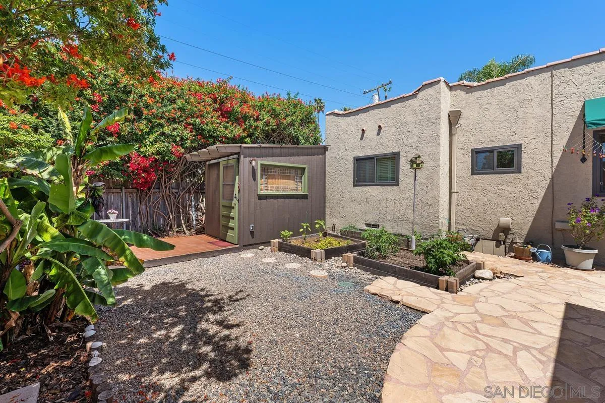 Welcome to this beautifully updated Spanish Bungalow in the heart of vibrant University Heights. Privately set yet incredibly walkable, this turnkey residence welcomes you with a lush courtyard entry and tranquil fountain—creating an immediate sense of charm and serenity. Rich in original character and thoughtfully updated for today’s lifestyle, the home showcases graceful archways, coved ceilings, and warm wood flooring. Sun-drenched living spaces are framed by new Pella dual-pane windows, enhancing energy efficiency. Thoughtfully upgraded throughout, the home features a resealed roof, newer HVAC system with new ductwork (2022), and owned solar—delivering year-round comfort and long-term savings. Additional improvements include foundation upgrades, a new gas line, insulated flooring, new floor registers, and a newer water heater. The light-filled kitchen offers abundant wood cabinetry, stainless steel appliances, a wine refrigerator, and a charming breakfast nook. Embrace a farm-to-table lifestyle with multiple garden beds, perfect for growing fresh herbs and vegetables. The exterior showcases drought-tolerant landscaping, fruit trees, and inviting garden spaces designed for effortless California living. A spacious detached one-car garage and private driveway provide valuable off-street parking. A standout feature is the detached workspace with electrical—ideal for a private office, yoga studio, or creative retreat. All appliances convey, including a Weber BBQ with a dedicated gas line, completing this exceptional offering.