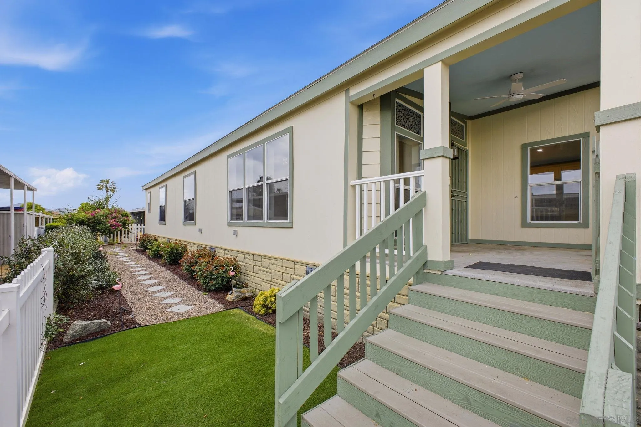 Welcome to this remodeled home located within the gated Rancho Mesa 55+ community. The front porch offers a comfortable outdoor space suitable for morning coffee, reading, or relaxing throughout the day. $1,750 Space Rent - Includes Utilities, Water, Trash, Sewer, and Amenities. Inside, the home features updated flooring, newer appliances, and refreshed interior finishes. The layout offers an open-concept living and dining area with natural light throughout, creating a bright and functional living space. The kitchen is positioned adjacent to the main living area and includes ample cabinet storage and included appliances, providing convenience for everyday use and entertaining. This home offers three bedrooms and two full bathrooms, allowing flexibility for guests, a home office, or additional living space. The primary bedroom includes an en-suite bathroom. The exterior includes landscaped areas and a private outdoor setting. The Rancho Mesa community features gated access and maintained common areas, with proximity to shopping, dining, and other everyday amenities.
