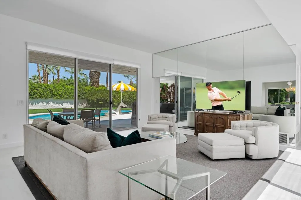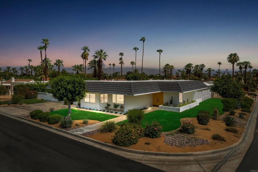 Welcome to Casa Via Corona, a 1970s time capsule; family rental in coveted Indian Wells. Enjoy a stay at this mid-century desert home! With 2,203 square feet and three bedrooms, up to 8 guests can visit and experience all that Indian Wells has to offer. Recently renovated, this beautiful home is the perfect location for all your Indian Wells adventures. Light and bright, comfortable and warm, youll love this space. Situated on a corner lot with mountain views, you are just a short golf cart ride from El Dorado Country Club, a few minutes to El Paseo for some shopping and fine dining, and just a few blocks from the famous tennis tournaments. Enter through double doors to a foyer overlooking an atrium and leading to a spacious formal living area with vaulted ceilings and abundance of natural light. To the left youll find a formal dining room and beyond that waits a well laid out kitchen full of charm with sunny yellow accents highlighting the island, bar, sink and countertops. A charming pass through to the dining area throws us back to a time that dinners were a formal affair. On the other side of the formal living room is an office that doubles as a bedroom. A large guest room overlooks the atrium off the entry and a full bath is at the end of the hall, boasting its own outdoor access. The master bedroom is oversized and overlooks the pool, featuring an en-suite bath and dressing area with plenty of closet space, dual vanities and a groovy step-down tub overlooking its own private outdoor space. The yard is large and private. With no HOA and a three-car attached garage, thi