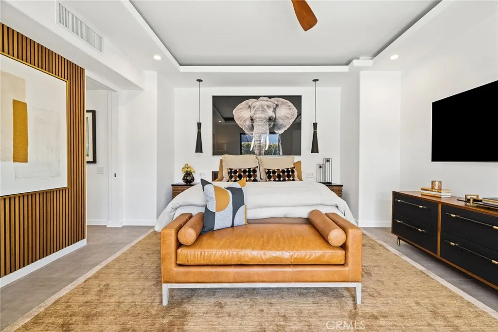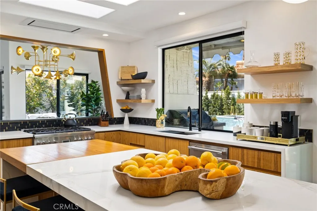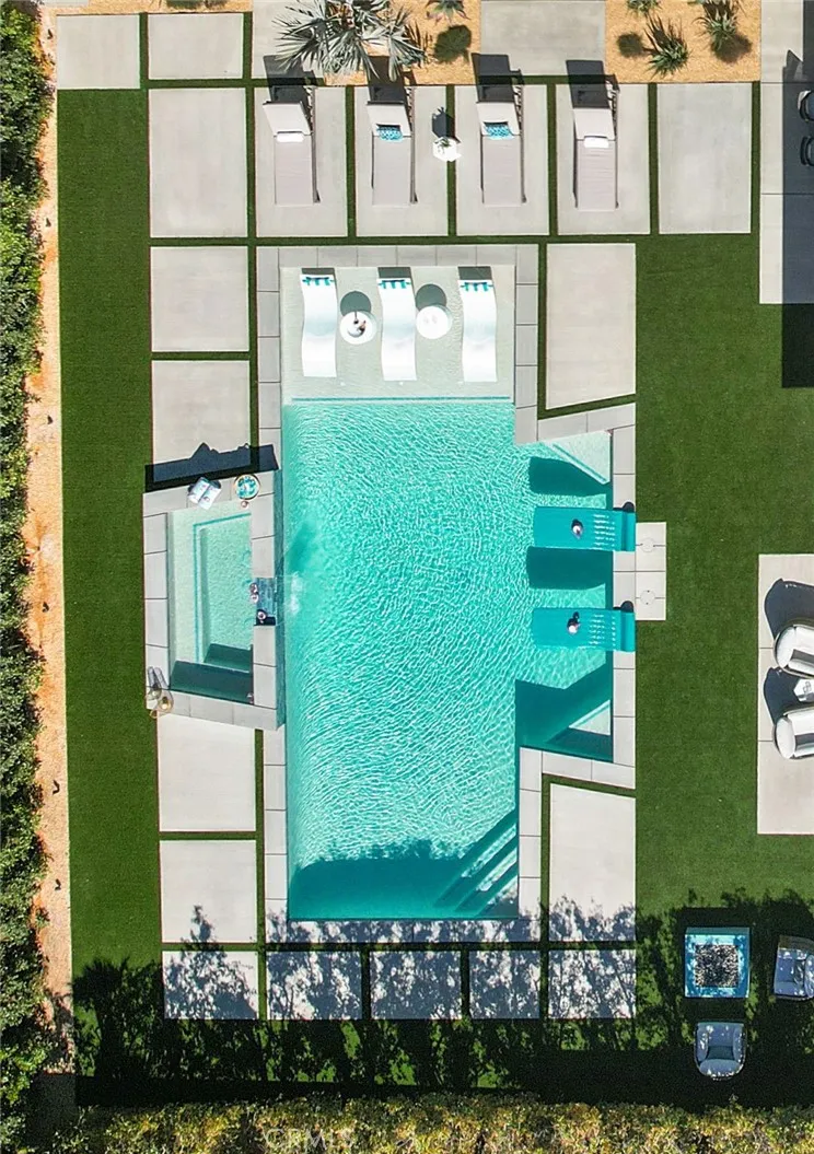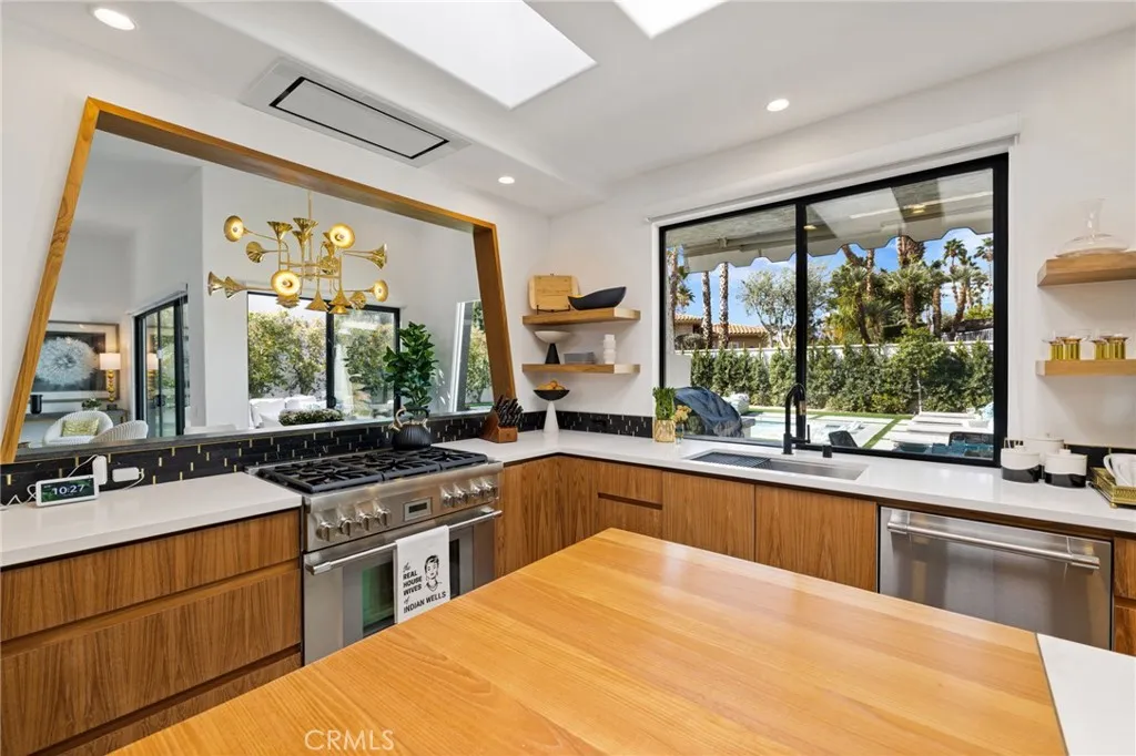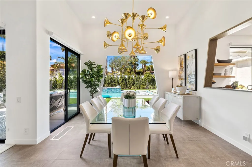 Rooted in the architectural language of 1960s modernism, this newly reimagined Indian Wells residence is a striking interpretation of mid-century design defined by bold geometry, dramatic volumes, and seamless indoor-outdoor living. Towering walls of glass flood the great room with natural light, revealing soaring ceilings, curated art walls, and sweeping desert and mountain views. A teak-clad chefs kitchen appointed with Thermador appliances and an adjacent den overlook the living space, enhancing the homes sense of scale and connection. Comprehensively renovated in 2022, the property blends refined materials with an effortless, livable elegance. Outdoors, a newly designed saltwater pool and oversized 12-jet spa are set within lush, private grounds featuring mature desert landscaping and citrus trees including grapefruit, lemon, lime, and kumquat. The primary suite is a tranquil retreat, opening to expansive mountain views with direct access to the pool and a private outdoor shower. The spa-inspired bath is richly appointed, complementing the homes elevated yet relaxed aesthetic. Offering four bedrooms (one currently styled as a den/office) and four baths, the residence also includes custom teak cabinetry, generous storage, a walk-in pantry, laundry room, indoor and outdoor fireplaces, an outdoor bar with built-in BBQ, and an oversized 2.5-car garage. Set on one of the areas most desirable streets, moments from Indian Wells Country Club, El Dorado, and The Vintage, this exceptional property captures the essence of private desert resort living, sophisticated, serene, and di
