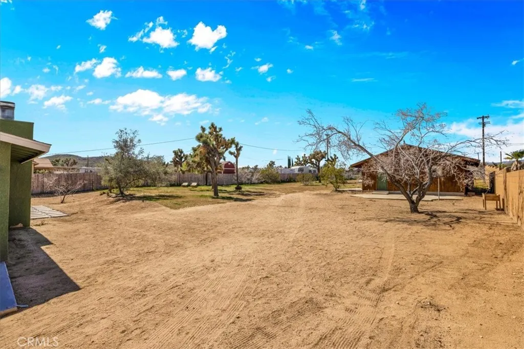 Located in the desirable Mesa area of Yucca Valley, this spacious 3 bedroom, 2 bath home sits on .67 acres and offers modern comfort, open living, and fantastic outdoor potential. An attached 2-car garage provides convenience, while the expansive interior layout creates an inviting place to gather and relax. The massive open concept living space features a classic masonry fireplace, stylish modern light fixtures, and laminate flooring that flows through the main living area, with tile flooring defining the kitchen and dining zone. The dining area includes sliding glass doors leading to the back patio and breakfast bar seating that connects seamlessly to the kitchen. The kitchen itself is well-appointed with stylish countertops, stainless steel appliances including a gas stove, and plenty of workspace. The guest bathroom showcases quartz counters, tile floors, and a walk-in shower. The primary bedroom is generously sized and includes its own sliding glass doors, a large closet, and an attached bath with dual sinks, additional closet, and a tub/shower combo. Both guest bedrooms are spacious and well positioned, and a built-in bench in the hallway adds character and functionality. Outside, the backyard offers a concrete patio, fencing for privacy, and a huge powered workshopperfect for hobbies, storage, or creative projects. With its blend of modern finishes, open design, and Mesa location, this home captures the best of high desert living.