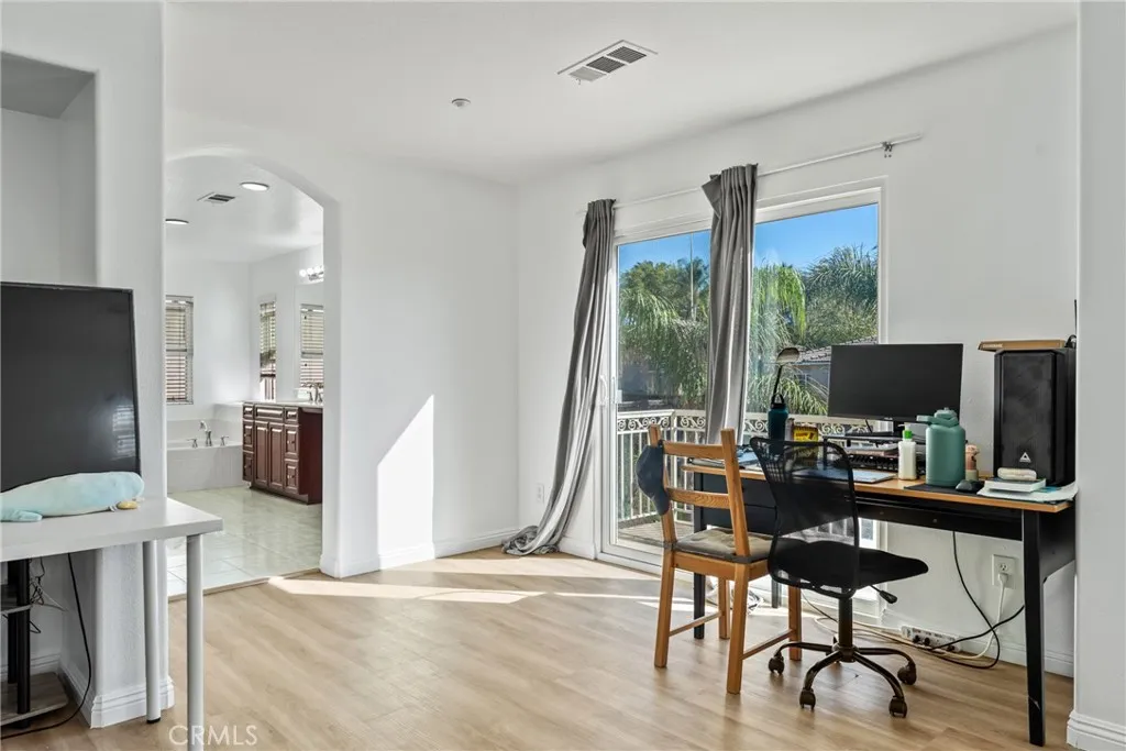 Come see this executive home that is situated in one of Riversides most desirable neighborhoods, this spacious five bedroom pool home offers comfort, style, and functionality. As you walk in you can appreciate large, bright and open floor plan that is enhanced by recessed lighting and stone flooring, creating a warm and elegant ambiance throughout. The gourmet kitchen is a chef's delight, featuring a large kitchen island with granite countertops, solid wood cabinetry, a large stainless-steel sink, custom pendant lighting, stainless-steel appliances, and sliding glass doors that open to the backyard. The kitchen flows seamlessly into the inviting family room, complete with a cozy fireplace and ceiling fan. Upstairs, the expansive primary suite offers a private balcony overlooking the entertainer's backyard, dual walk-in closets, and a luxurious en-suite bathroom with double vanities, a glass-enclosed shower, and a jetted soaking tub. The secondary bedrooms are generously sized with mirrored closet doors and share a beautiful bathroom. A spacious bonus room/loft provides versatile space for a home gym, office, media room, or potential sixth bedroom. A convenient first floor bedroom and full bathroom can accommodate guests or multi-generational living. There is a dedicated indoor laundry room and a two-car attached garage with direct access. The home has all new interior paint and new luxury vinyl flooring from the stairs and all upstairs. The beautiful and private back yard features a sparkling swimming pool and spa, a fire pit, palm trees and some fruit trees, ideal for rela