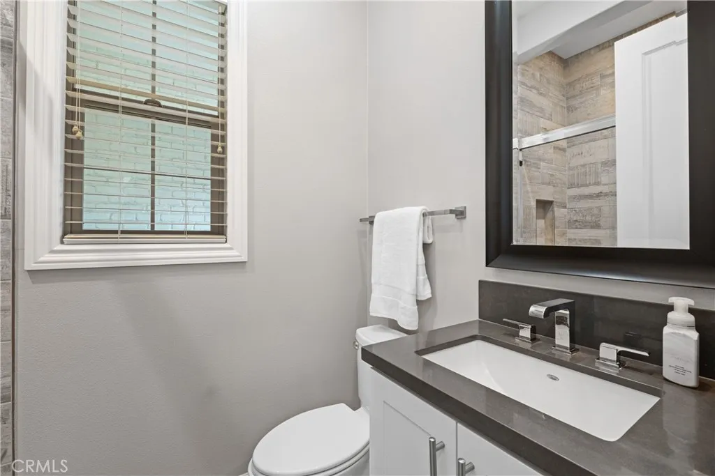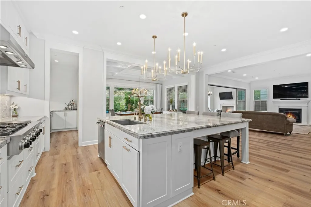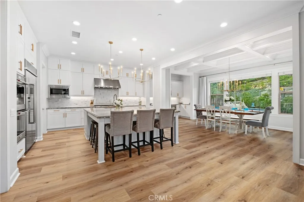 Nestled within the coveted Esencia community of Rancho Mission Viejo, this exceptional 5-bedroom, 5.5-bath Aubergine Plan 3 residence has been thoughtfully upgraded and meticulously designed. Refreshed with new exterior paint, the home offers impressive curb appeal. A charming courtyard welcomes you and separates the home from the casita, ideal as an office or guest suite with its own entrance, newer AC, and full bathroom. Inside, wainscoting frames the grand staircase and elegant foyer. Fresh interior paint and new luxury vinyl flooring on the first level create a bright, contemporary aesthetic. Every window features custom casing, complemented by 10" crown molding and dimmable smart switches. A flexible downstairs den offers endless possibilities. The open-concept living space is the heart of the home, where the kitchen seamlessly connects to the family and dining areas. The kitchen showcases white cabinetry with new champagne gold hardware, an oversized granite island, and premium stainless-steel appliances including a built-in refrigerator, double oven, 6-burner cooktop, and microwave. Coffered ceilings and new chandeliers elevate the dining area, while the extended dry bar has dual beverage refrigerators. A walk-in pantry and timeless backsplash complete the space. Stackable sliders open to a serene California room, where you can enjoy fireplaces both inside and out. The private backyard features low-maintenance turf with app-controlled sprinklers, pavers, apple trees, and a saltwater pebble tech spool with waterfall and fire pit. Upstairs, the primary suite offers bea