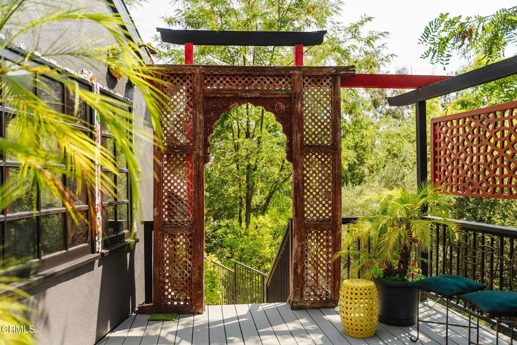A Private Designer's Retreat in the upper Alta Canyada neighborhood of La Canada Flintridge! Tucked behind a balinese gated entry and enveloped by majestic deodar trees, this sprawling 4 bedroom, 3.5 bathroom estate is an inspiring private oasis. With a lineage of interior designers as past and present owners, the home is an intentional masterpiece--where every room and outdoor space is a curated blend of style, comfort, and creativity. Colorful design moments fill the home with life, while abundant skylights and solar tubes bring in soft, natural light, adding dimension and warmth to every space. And beyond beauty, there's peace of mind: the current owner has installed a rare and thoughtful permanent copper rooftop sprinkler system powered by gas. It operates on house water during high-risk periods and automatically switches to draw from the pool in case of evacuation, offering enhanced fire preparedness. This home offers a convenient floor plan with an indoor-outdoor flow of common rooms in the center and two bedrooms on either wing. The bright eat-in kitchen offers high-end appliances with new Sub-Zero refrigerator, dishwasher, and wine fridge. A generous sized dining room with mirrored textured and paper covered walls, chandelier, skylights and French doors to the backyard. The custom designed living room features a fireplace, tin ceiling, reclaimed wood built-ins and collapsible doors to the outdoors. Designed for both solitude and inspiration, the property features tranquil outdoor living areas and a sparkling pool, making it ideal as an artist's retreat or entertaine