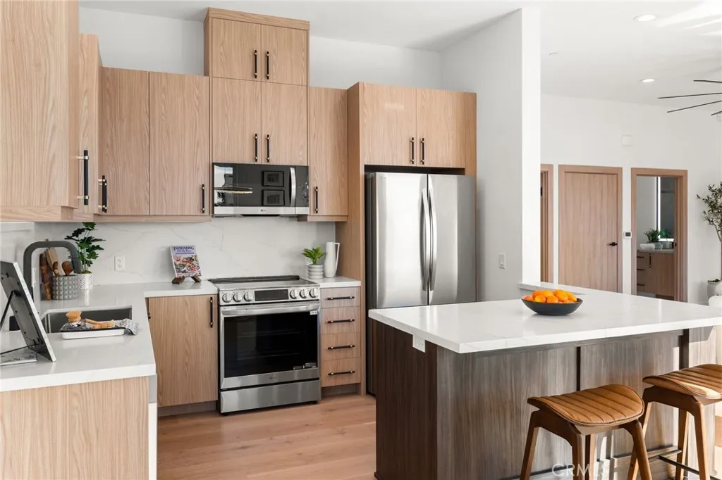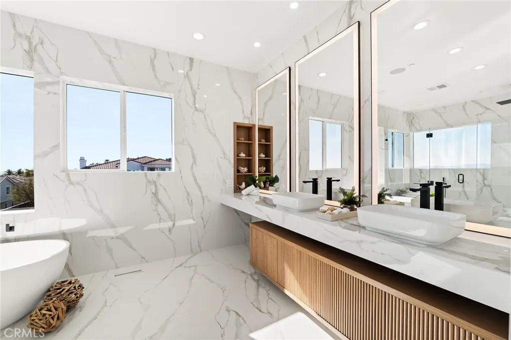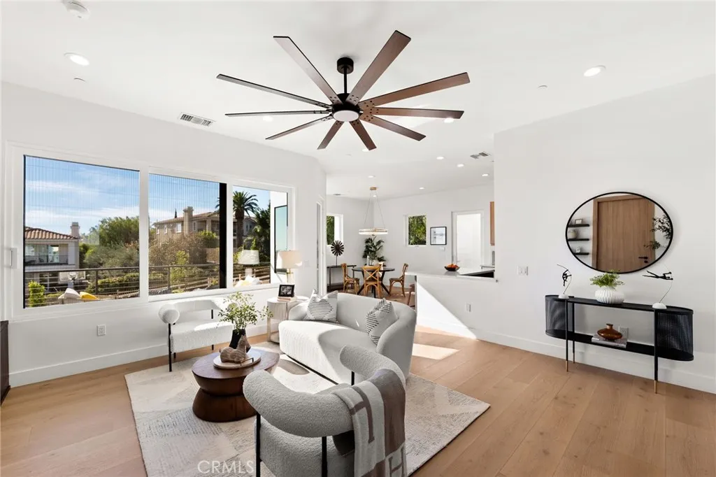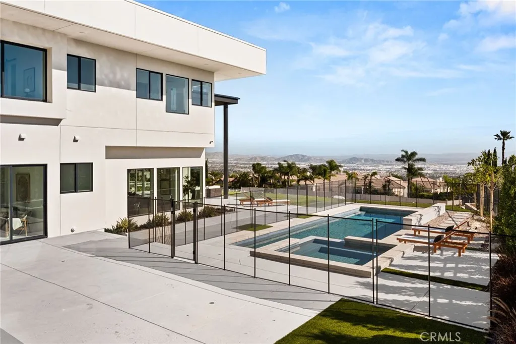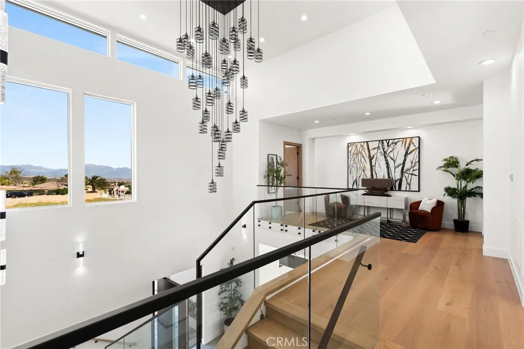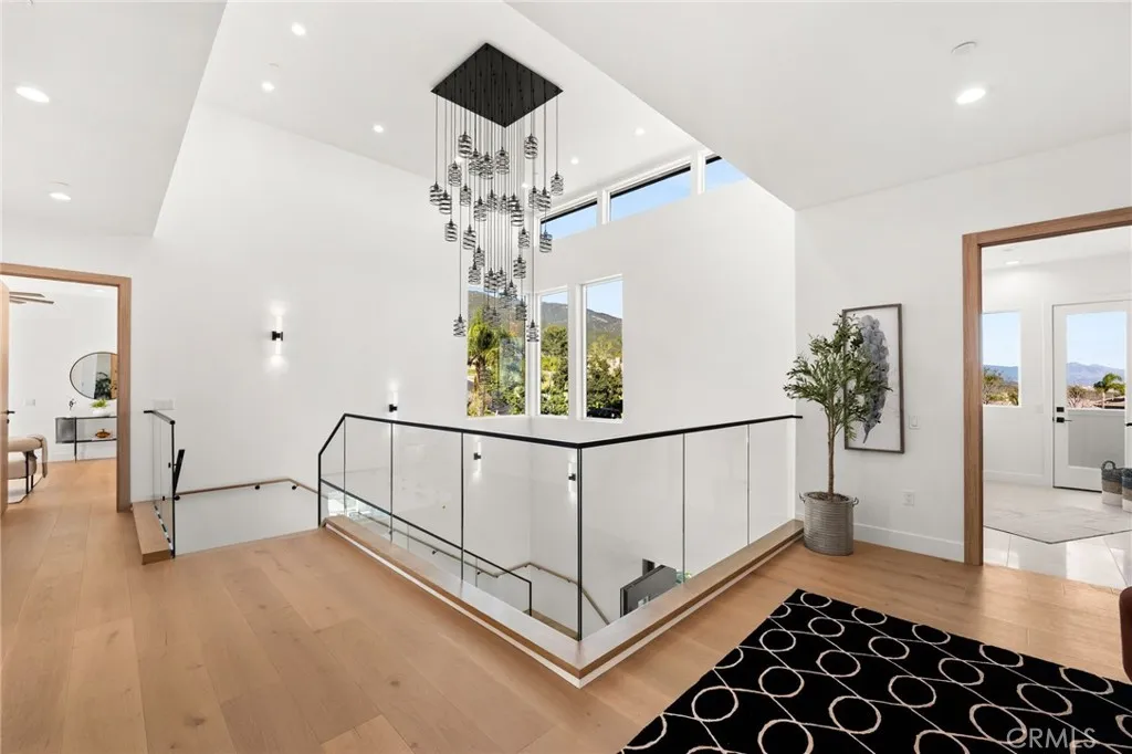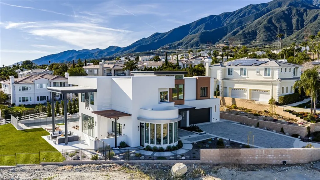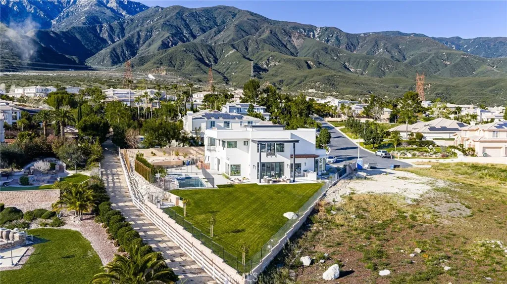 Welcome to The Summit House, an extraordinary modern architectural masterpiece boasting 3,963 square feet of exquisitely crafted living space in the main residence, perched at approximately 2,150 feet above sea level at the end of one of Rancho Cucamongas most private and elevated cul-de-sacs. This bespoke estate embodies a seamless fusion of precision engineering, sophisticated design, and elevated lifestyle. A striking 27-foot glass tower and floating portico announce your arrival, opening to a grand foyer defined by soaring ceilings and a sculptural glass staircase. The main living level is anchored by an 18-foot feature wall clad in slab marble with a fireplace, integrated bar, and expansive disappearing glass walls that dissolve the boundary between interior and resort-inspired grounds. Outside, 22-foot steel columns frame a covered patio overlooking a modern pool and elevated spa, meandering water features, a vineyard, orchard, and meticulously manicured lawns all conceived for privacy, serenity, and visual harmony. The chefs kitchen is a triumph of design, featuring Italian Stosa cabinetry, a dramatic 12-foot waterfall island, and fully integrated Thermador appliances. The residence offers three gourmet kitchens, opulent en-suite bedrooms, spa-caliber baths with advanced smart technology, and a primary suite with commanding mountain and valley views. An upper-level Sky Residence provides over 950 square feet of private quarters with its own entrance, kitchen, and bath perfect for guests or extended family. Engineered for ultimate performance, the home is equipped w