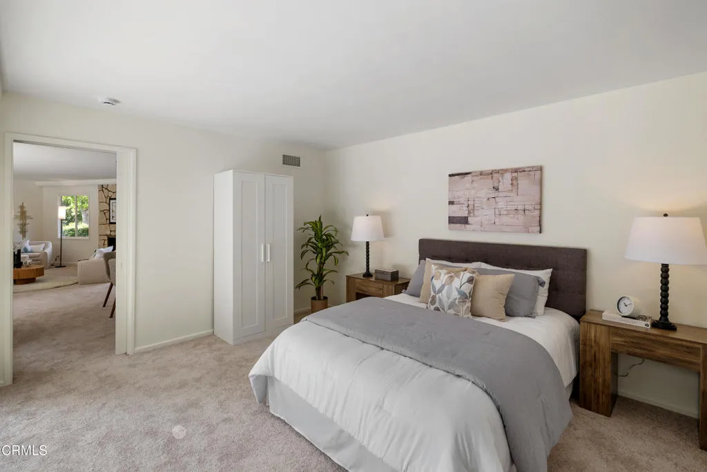 Tucked away on a peaceful cul-de-sac within one of La Canada Flintridge's most desirable neighborhoods, this inviting residence blends privacy, comfort, and timeless charm. Surrounded by an abundant landscape, the home welcomes you up a brick-paver driveway to a serene setting perfect for those seeking both tranquility and convenience. Inside, the bright and airy living room features a wall of windows overlooking the verdant backyard and patio. A flagstone hearth frames the gas fireplace, creating a warm focal point for gatherings. New carpet adds a fresh touch throughout, while the adjoining dining area offers seamless flow for entertaining. Next to the dining room, you will find the first of the 3 bedrooms this home offers. This versatile room could also be used as a den space or a convenient home office. The spacious kitchen boasts tile countertops, a five-burner electric range and oven, and a cozy breakfast nook. Just beyond lies a convenient laundry area, a quarter bath, and direct access to the attached two-car garage, as well as a back door leading to the patio and yard. Down the main hallway, you will find 2 bedrooms that offer comfort, an abundance of natural light, and ample closet space, while the hallway bathroom features dual sinks, recessed lighting, tile countertops, and a sunken tub/shower combination. The primary suite, situated at the rear of the home, enjoys tranquil views of the lush greenery throughout the backyard, new carpeting, a ceiling fan, and an updated ensuite bath with a quartz-topped vanity, tile flooring, and a glass-enclosed shower with a bu