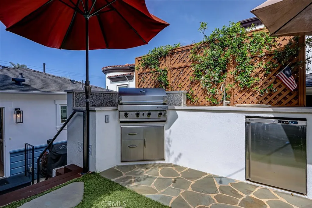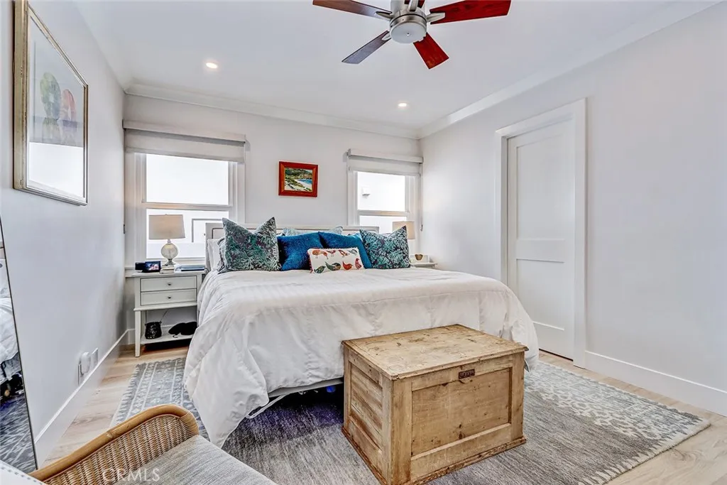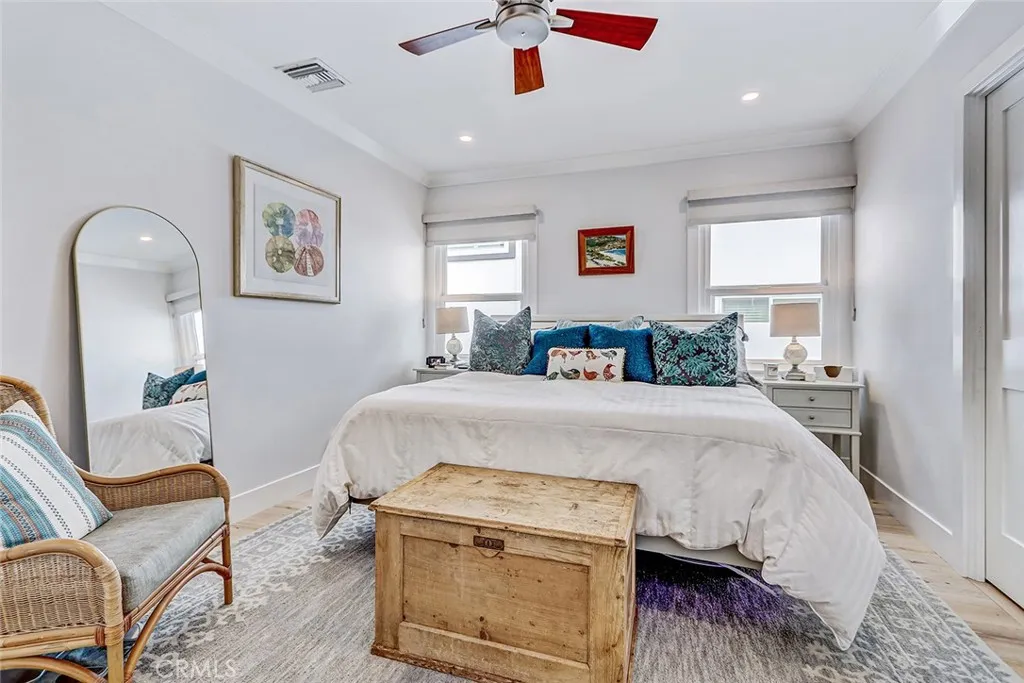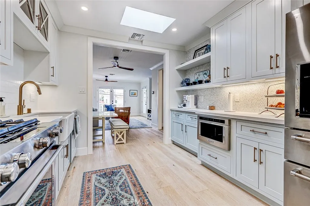 Tucked along a peaceful stretch of South Redondo, 517 Sapphire Street is a pristine beach cottage that radiates coastal charm and refined craftsmanship. Every inch of this immaculate home reflects thoughtful designbright, balanced, and beautifully finished with magazine-worthy appeal. The living room welcomes you with a glass entry door and soft coastal textures. A beadboard ceiling and white slatboard accent wall add dimension, while ceiling fans keep the space cool on breezy days. Double French doors open to an elevated front deck, the perfect spot to enjoy ocean breezes and glowing sunsetsa seamless blend of indoor comfort and outdoor serenity. Wide-plank oak floors guide you into a sunlit kitchen where timeless design meets function. Quartz countertops, white shaker cabinetry above, and soft blue-green tones below create an elegant coastal palette accented by brushed gold hardware. A farmhouse sink, marble-and-mosaic backsplash, and skylight fill the space with light. High-end KitchenAid appliances, a beverage center, floating shelves, and a built-in dining nook make this kitchen both stylish and inviting. Both bedrooms echo the homes relaxed sophistication, featuring crown molding, wide baseboards, and dual-pane windows for warmth and quiet. The primary bedroom embraces clean lines, while the west bedroom benefits from afternoon light. The bath is beautifully appointed with marble floors, a jetted soaking tub, and mosaic glass inlays that add subtle artistry. Step through the kitchens Dutch door to a private backyard designed for coastal entertaining. A custom pergola