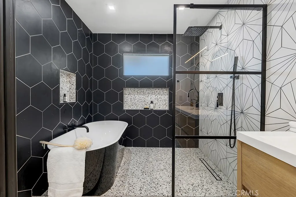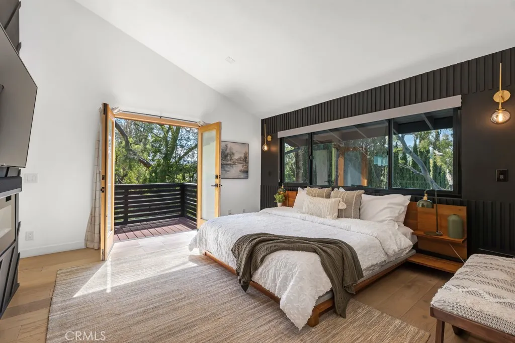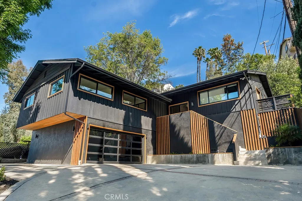 Ideally tucked away at the end of a private flag lot, this reimagined and ultra sleek Mid-Century Modern masterpiece is a true architectural statement. An industrial iron-and-glass double-door entry reveals a light-drenched, open-concept interior defined by soaring double-height vaulted ceilings and exquisite wide-plank flooring throughout. The chefs kitchen has epic panoramic views and serves as the homes centerpiece, anchored by a massive single island with imported Brazilian quartzite countertops, professional-grade Viking appliances, and a spacious walk-in pantry. Framed by expansive windows and multiple sets of French doors, the living space offers a seamless indoor-outdoor flow to wrap-around decks and a flat lounging pad. The backyard is a private sanctuary, featuring a romantic covered sitting area perfectly that is perfectly positioned to capture breathtaking daily sunsets. Set on a rare 13,969-square-foot lot that, the property offers unparalleled privacy, exclusivity, and space. Complete with a luxurious oversized primary suite with a gorgeously updated ensuite bathroom, and its own private viewing balcony. Located just walking distance from Ventura Boulevard with all of the community's vast amenities, this home is ideal for elite and luxurious living.
