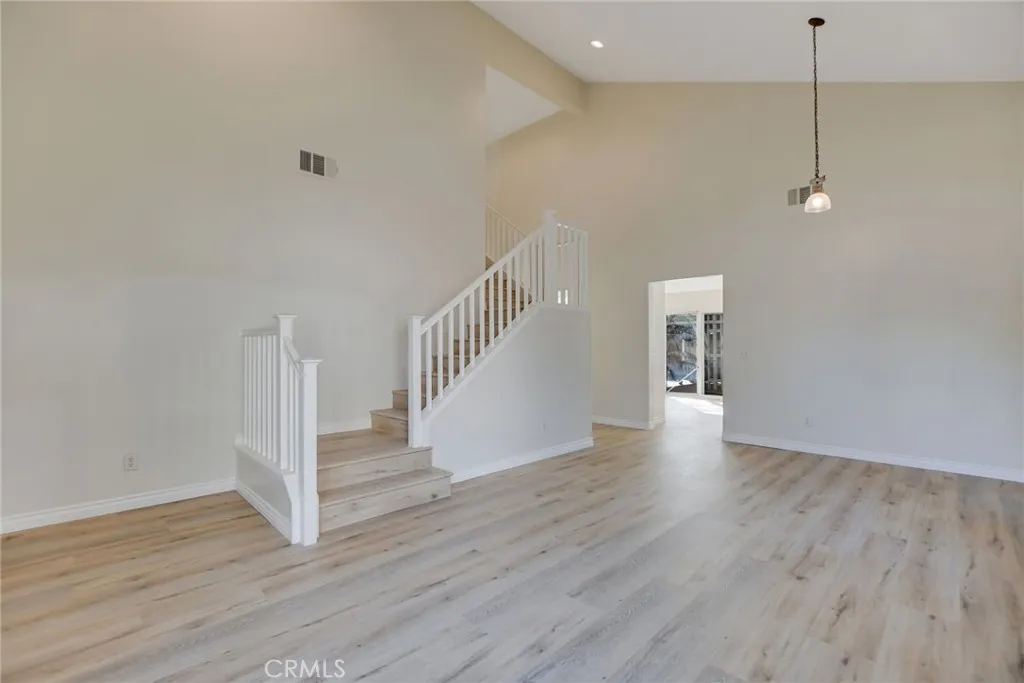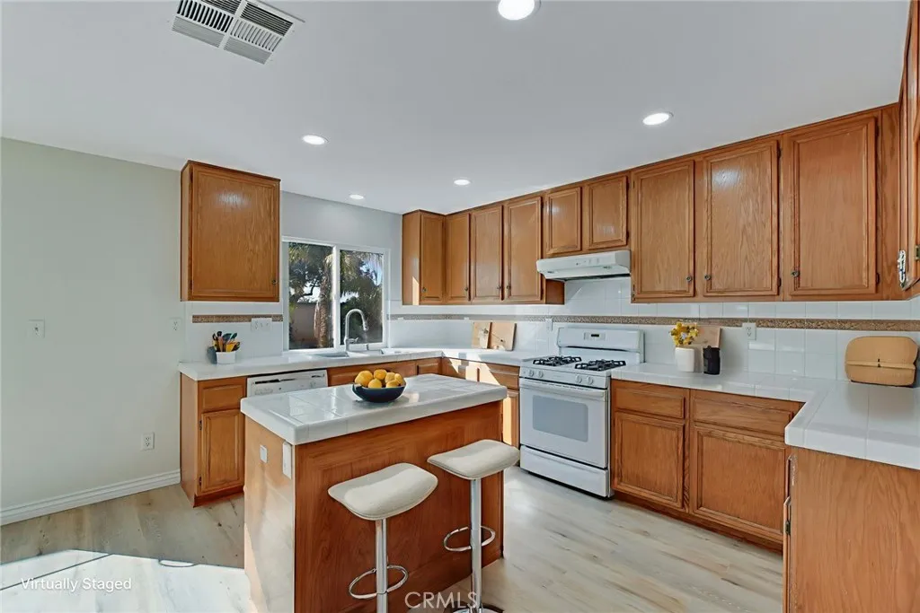 Absolutely gorgeous two-story home in a prime location recently updated with interior paint and new flooring throughout. This home has so much to offer, including a spacious living room with high ceilings and a cozy family room with a fireplace. The kitchen and dining area are open and inviting, featuring a center island, recessed lighting, a built-in office desk area, and tile flooring. Downstairs, you'll find two bedrooms and a full bathroom. Upstairs include three generously sized bedrooms, including the main suite with its own private bathroom. The main suite boasts a dual-sink vanity, walk-in closet, enclosed shower, and a relaxing bathtub. The spacious backyard features orange trees and a covered concrete patioperfect for entertaining. There's also plenty of room to add a pool or start your own vegetable garden. Additional features include an indoor laundry room with tile flooring and shelving, a two-car attached garage, low HOA, and a convenient location close to parks, shops, entertainment, freeways (91, 60, and 15), golf courses, and restaurants.