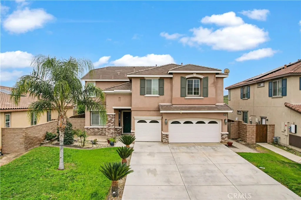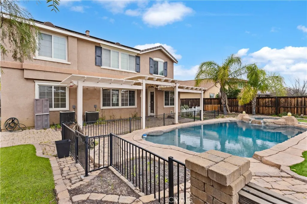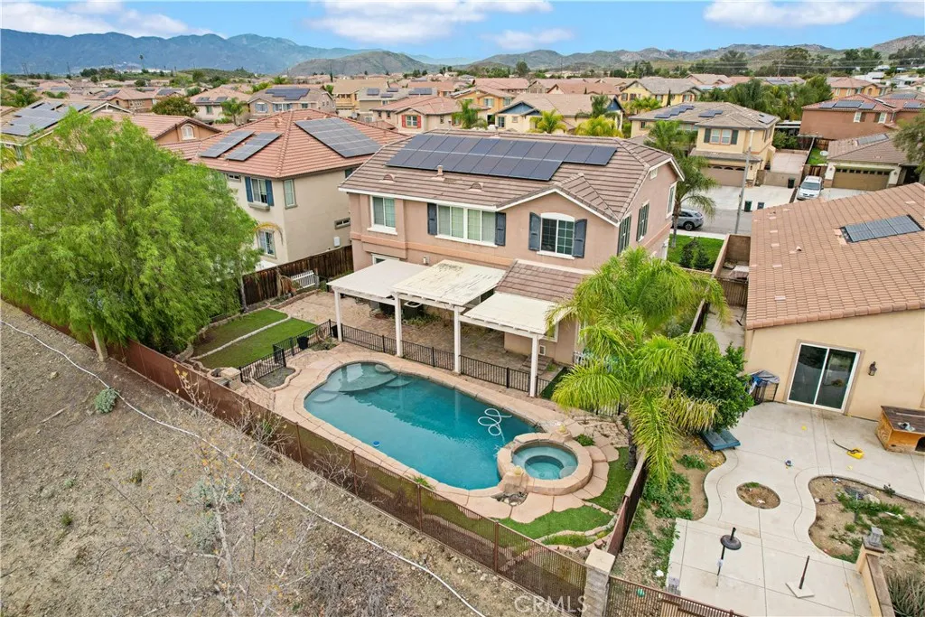 JUST BACK ON THE MARKET!!! BUYER WAS NOT ABLE TO SECURE A LOAN. Stunning pool home located in the highly desirable Rosetta Canyon community, offering 4 bedrooms plus a den and 3 full bathrooms. Ideally situated just minutes from shopping, dining, Lake Elsinore, and the 15 Freeway. Upon entry, youre welcomed by a formal dining area with tile flooring that flows into a spacious open-concept layout, perfect for both everyday living and entertaining. The kitchen features tile countertops, abundant cabinetry with under-cabinet lighting, recessed lighting, a large walk-in pantry with a custom door, and a custom island with rustic accents. The living room showcases soaring ceilings, laminate flooring, and a cozy fireplace. The main level includes a den with recessed lighting, easily convertible to a fifth bedroom, and a full bathroom with a shower. Upstairs, the expansive primary suite features laminate flooring and a fireplace. The en-suite bathroom offers a separate soaking tub and glass-enclosed shower, dual-sink vanity, private water closet, and two closets. Three additional bedrooms are generously sized and finished with laminate flooring. The backyard is a true private retreat, featuring a covered patio, custom saltwater pool and spa with security gate, and a tiered astro-turfed area anchored by a mature California Pepper tree. Enjoy sweeping valley views with no rear neighbors. Low HOA dues provide access to outstanding community amenities, including sports fields, basketball, baseball, football, and tennis courts, a dog park, and childrens playground.