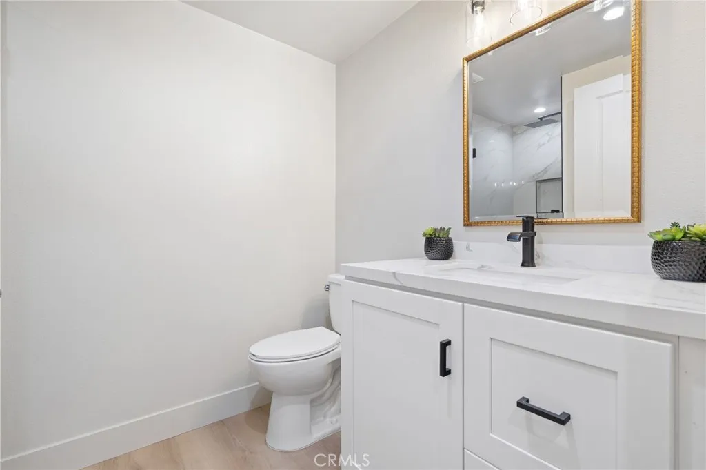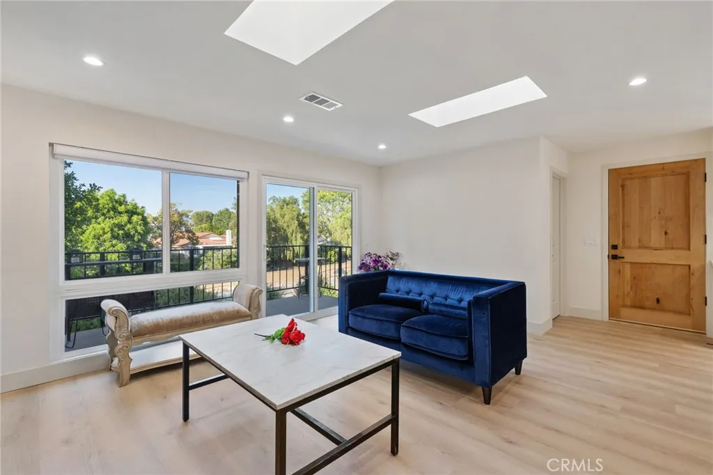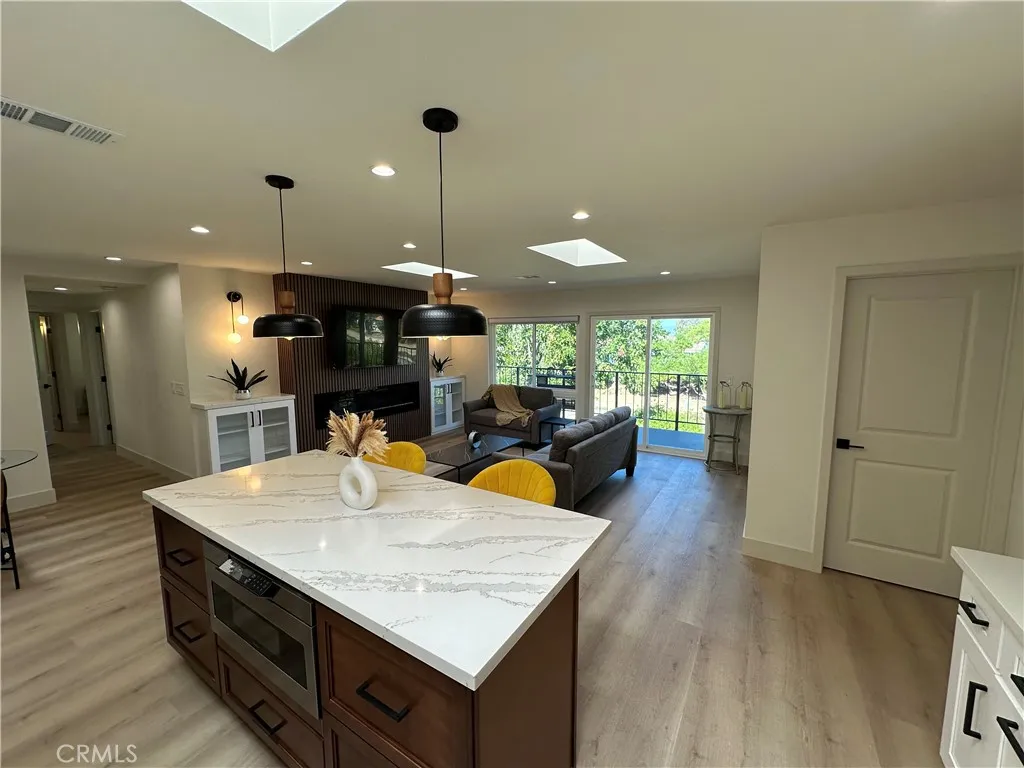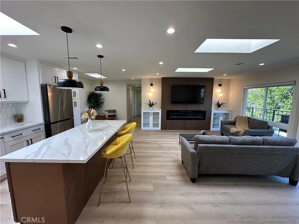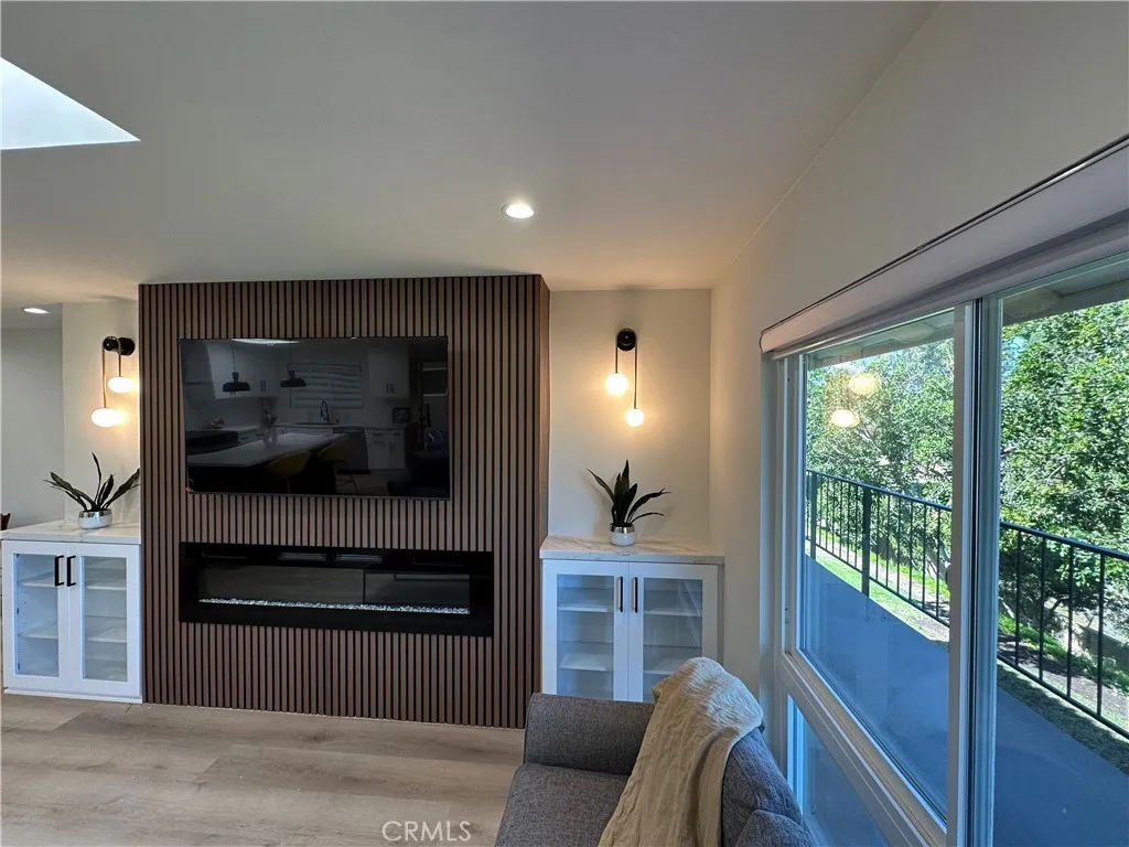 This Casa Vista Stunner has been tastefully remodeled to modern expectations with an open floor plan featuring multiple skylights in kitchen, dining and living room with fantastic privacy in the rear balcony. Enjoy warm summer evenings and cool ocean breezes from your balcony which offers some views of the surrounding hills and treetops. This home is also equipped with an HVAC system to keep you cool in the summertime and warm during chilly winter months. No expense has been spared with new windows, sliders, LVP flooring, recessed lighting, remodeled kitchen and bathrooms as well as custom blinds for the bedrooms. A spacious walk-in-pantry closet has been added for convenience. Living room features a unique Slat styled wall with cable hookups ready to go, along with custom end cabinets and lighting on both sides with a new electric fireplace below. Master Bedroom is spacious and features direct access to the beautiful master bathroom suite and walk in closet. Both bathrooms have been completely remodeled into modern styled bathrooms featuring frameless glass shower doors, porcelain tiles, shaker cabinets, new sinks, faucets, quartz countertops, vanity lights, and mirrors. NO STAIRS OR STEPS from assigned carport nearby to front door. New solid wood front door with window for additional lighting and conveniently located walking distance to clubhouse 6 and just down the street from Gate 10 entrance. Come enjoy the incredible amenities Laguna Woods has to offer those seeking an Active living style or retirement with the security of a Gated Community. This street has really bea