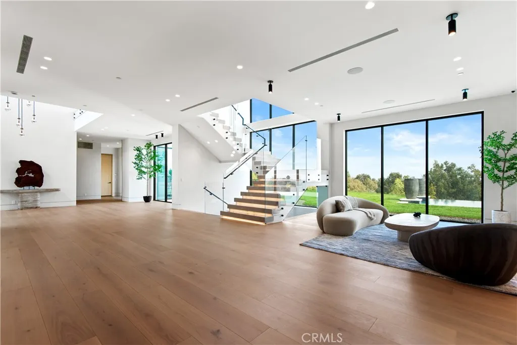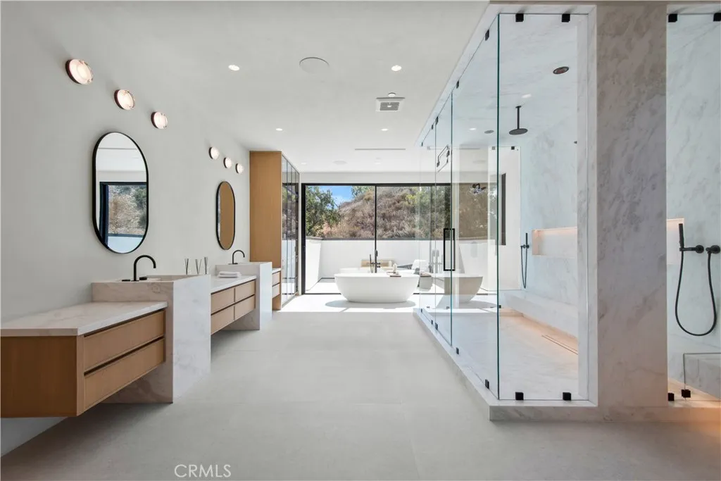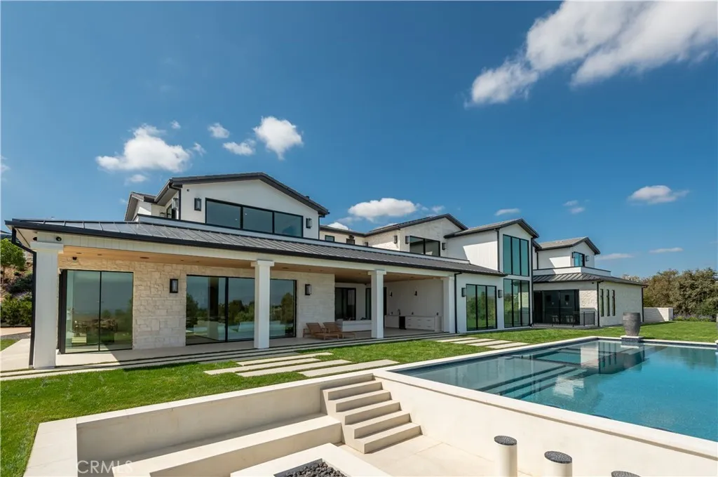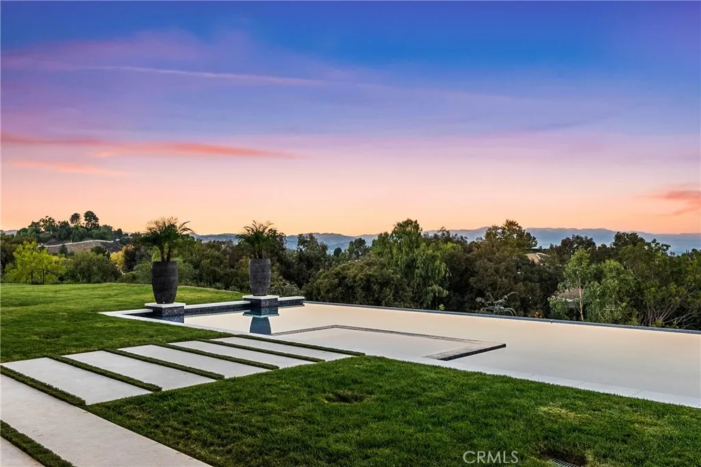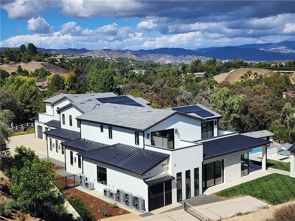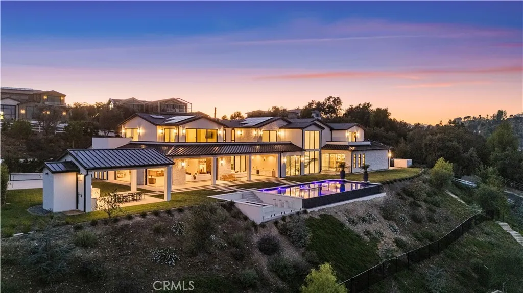 Panoramic views and curated design define this gorgeous, newly constructed estate, nestled at the end of a quiet cul de sac and sited on a large private lot within the guard-gated community of Hidden Hills. Perfectly positioned to capture the sweeping pastoral and city light views, this custom-built residence delivers a seamless blend of elevated architecture and indoor-outdoor living. The sunny, open floor plan centers around a stunning chef's kitchen with oversized island, prep kitchen, and counter seating that flows into the dramatic great room, anchored by a two-sided fireplace & sliding walls of glass that frame the endless views. Designed for grand scale entertaining and everyday comfort, the home features a spacious game and recreation room, custom home office, dedicated wellness wing with gym, steam room & sauna, a plush home theater with fabric covered walls, a sleek lounge with wet bar, and a glass encased, refrigerated wine cellar. Both levels include an additional den or flex spaces, and all six ensuite bedrooms are thoughtfully designed, connected by a floating architectural staircase and serviced by an elevator. The luxurious primary suite is a true retreat, complete with fireplace, stone-wrapped spa bath with steam shower, boutique sized custom closet, and a large, wraparound balcony with commanding views. The estate comprises four distinct structures. In addition to the main residence, which includes garages for seven cars with custom epoxy floors, the grounds feature a pool pavilion complete with a built-in barbecue and pool bath, a detached 965 square foot