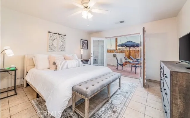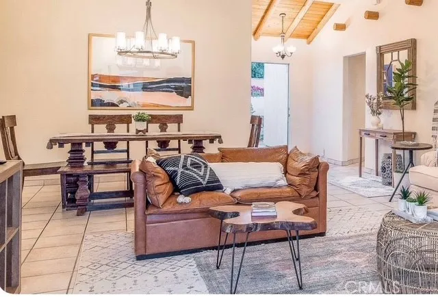 Welcome to this beautiful Santa Fe Style Desert Villa. The breathtaking Santa Rosa mountains surround you upon arrival at this magical desert escape. Step into the gated front courtyard as you are welcomed to your 3 bedroom, 2 bath home, then glance back to take in the mountain views over the flowering bougainvillea. Continue to walk through the original wood beamed entrance and be delighted with the comfortable and inviting interior. A large open dining and living space flow from front to backyard. Double French doors open to the newly renovated private pool and spa area which includes a covered deck with dining table for 6, lounge chairs and umbrella, and a relaxing hammock. Float in the pool and soak up the sun, enjoying the space to its fullest. As you return inside, enter the kitchen with original terra cotta tile and Spanish details which make for an inviting space to cook your meals. Two barstools and a counter offer extra kitchen seating. The living room is outfitted with a large comfortable leather sofa and loveseat, smart tv and fireplace. The decor is a Spanish/Bohemian blend that brings an element of relaxation to this beautiful Santa-Fe style home. Through the hallway, the primary bedroom invites you with a king-size bed and a bedside table with convenient usb port. A desk workspace in the primary also gives the ability to work from home. This room also opens with double French doors to the back yard. On the patio off the primary, a table for two invites you to enjoy a morning coffee or an evening libation as you unwind in your completely private space. The pri
