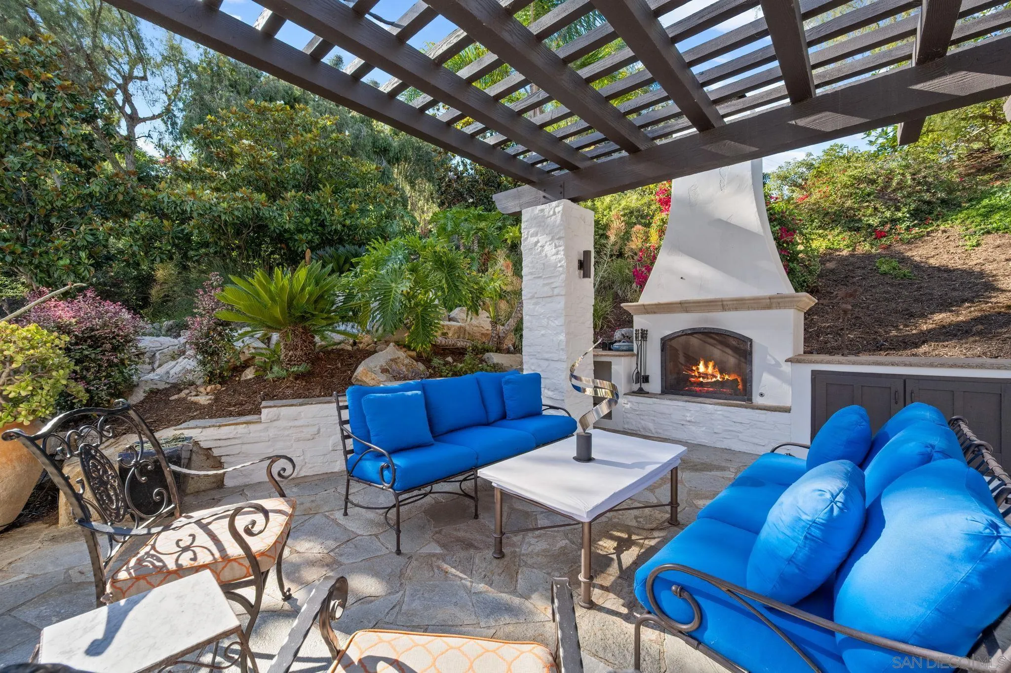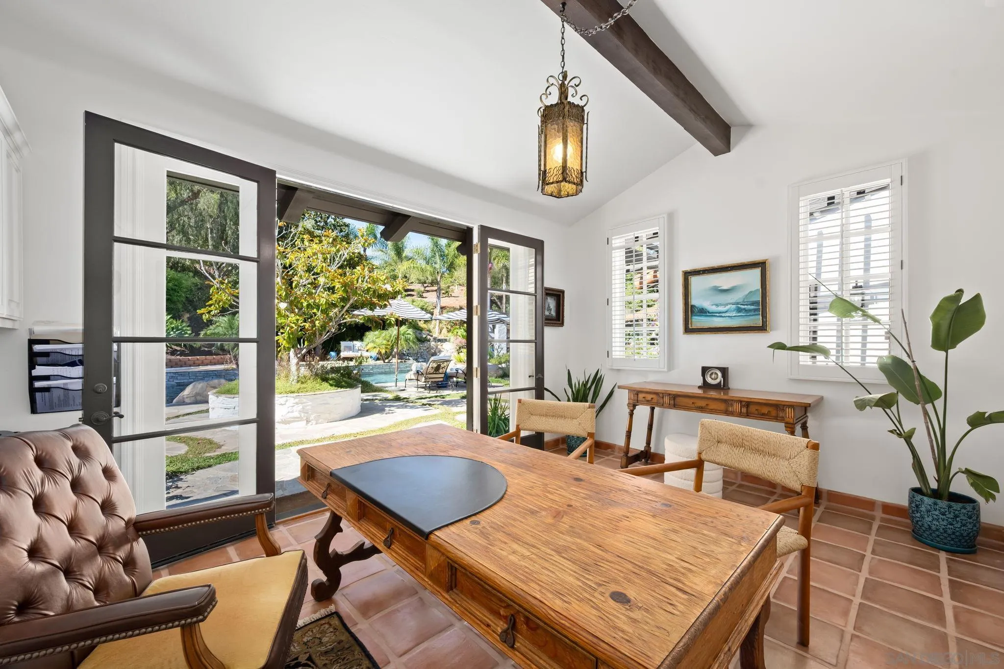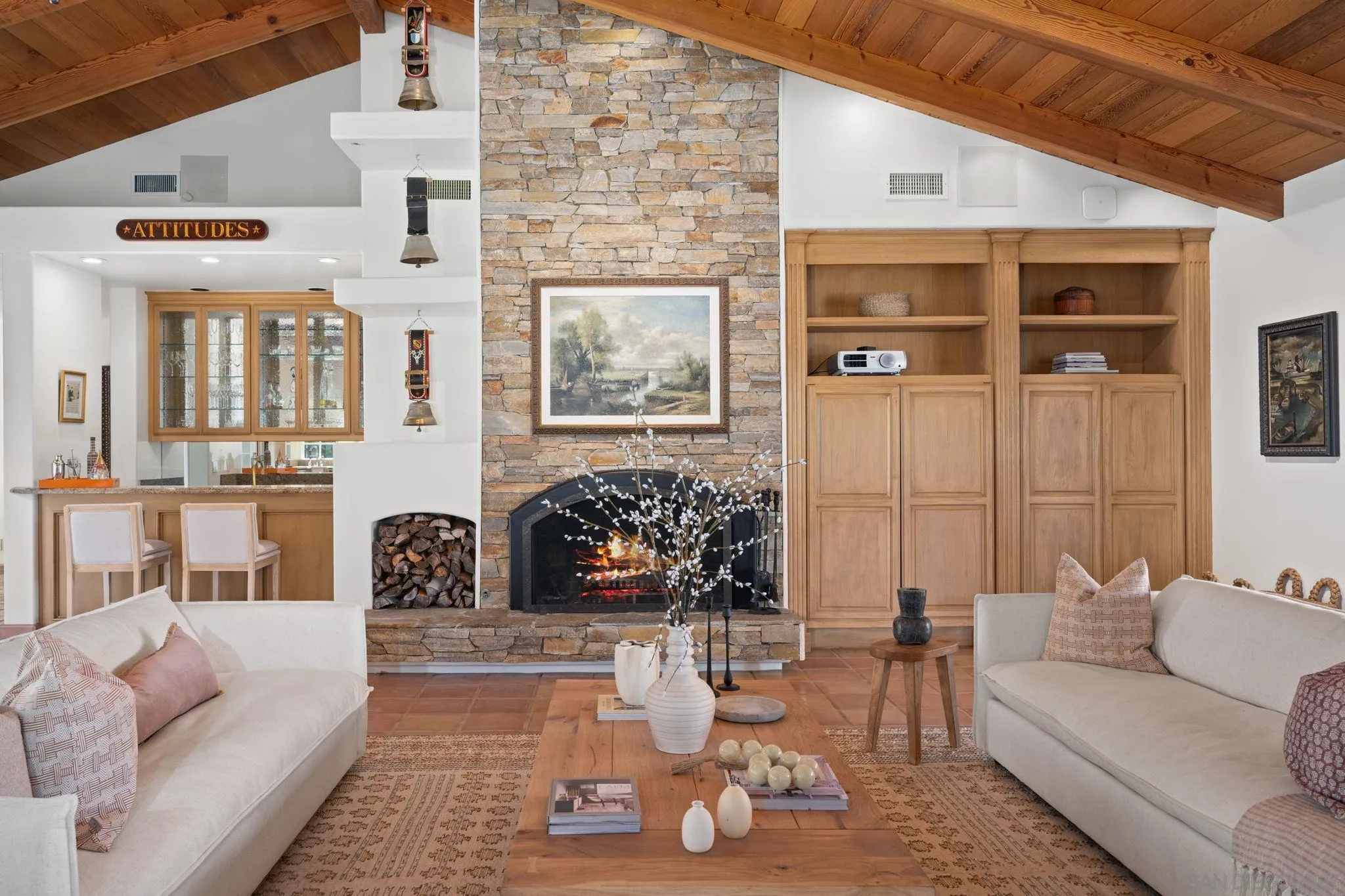 INCREDIBLE single-level estate located in the prestigious Rancho Santa Fe Covenant. Privately gated on 3.39 acres of picturesque land with serene views and unmatched privacy. This light-filled home features Saltillo tile throughout, 4+ bedrooms including a spacious live-in guest suite, and an expansive primary retreat with a reimagined spa-inspired bath complete with soaking tub, custom oversized walk-in steam shower, and private courtyard with hot tub. Additional highlights include a full gym, executive library, dedicated office, and a custom bar perfect for entertaining. The layout flows seamlessly to a resort-style saltwater pool with hot tub, splash pool, cascading waterfall, and a spacious covered patio with built-in BBQ and wood-burning fireplace, the ultimate setting for indoor-outdoor living. Smart home upgrades include built-in speakers, Pentair system, Doorbird, security cameras, EV charger, and fully owned solar with 3 backup batteries for easy living. A generous motor court, 200+ avocado tree grove, and family citrus orchard make this home truly special!