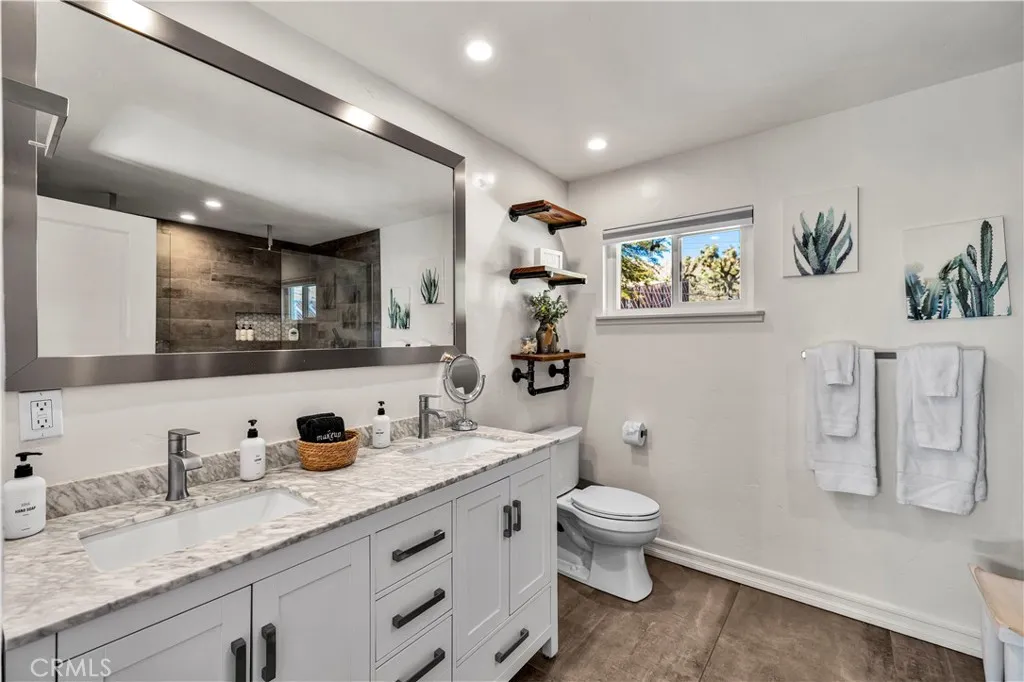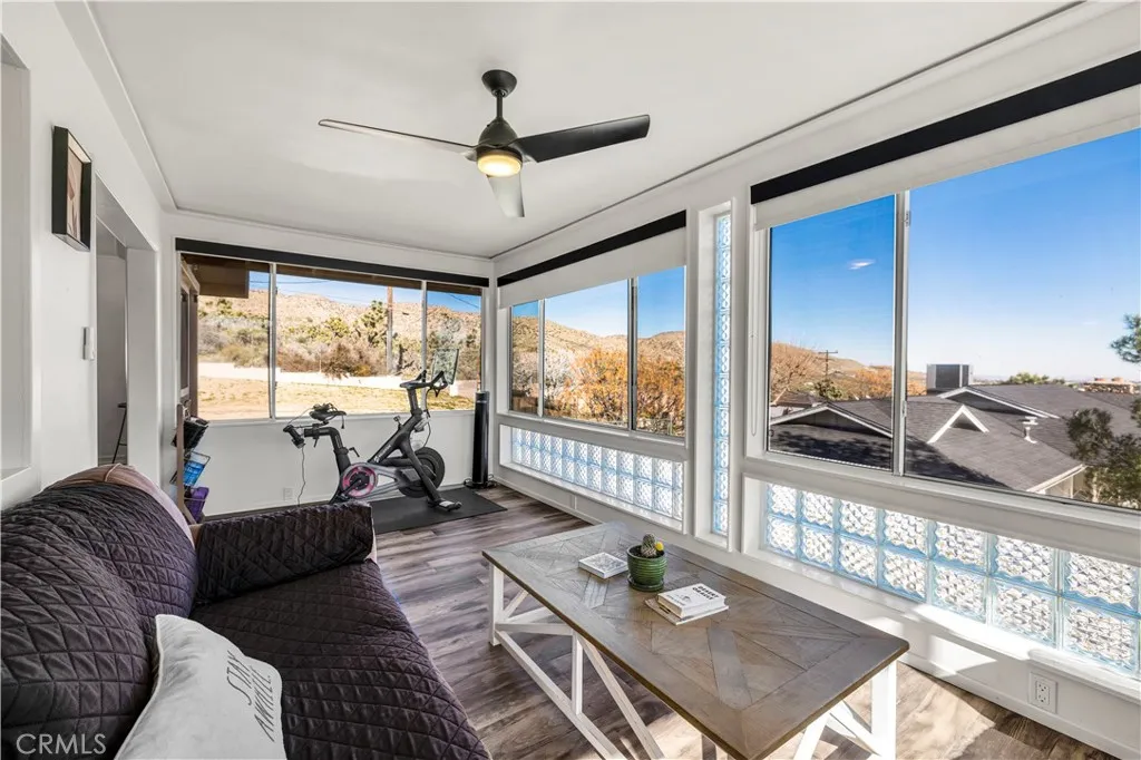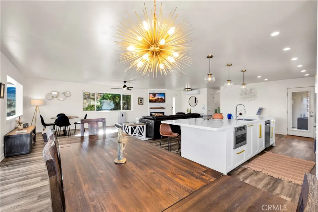 Welcome to this beautifully remodeled 2-bedroom, 2-bathroom home located high in the desirable Country Club Estates neighborhood of Yucca Valleyjust up the street from the local golf course. This home is a turnkey short-term rental and offers elevated views, stylish upgrades, and everyday functionality. As you arrive, youll love the curb appeal, mature landscaping, and the convenience of two long concrete driveways providing ample parkingperfect for RVs, trailers, or toys. A drive-through gate leads to the fully fenced backyard for added versatility. Inside, youre greeted by an open-concept layout with luxury vinyl plank flooring throughout. The living, dining, kitchen, and sunroom flow seamlessly, offering a massive combined living space filled with natural light and panoramic desert views. The fully remodeled kitchen features beautiful cabinetry, quartz countertops, a large center island, high-end Viking stainless steel appliances, ample storage, and even a hidden laundry area tucked behind custom cabinet doors. The sunroom, with its retro glass block and sweeping views, serves as a bright and stylish bonus space. The spacious primary suite includes a walk-in closet and a stunning ensuite bathroom featuring dual sinks, a large walk-in tile shower with dual rain showerheads, and sleek glass panels. The guest bathroom is equally impressive, with dual sinks and a fully remodeled shower/tub combo. The additional bedroom is generously sized and well-appointed. Step out back to enjoy the expansive concrete patioperfect for entertainingalong with a private spa and fire pit. Beyo