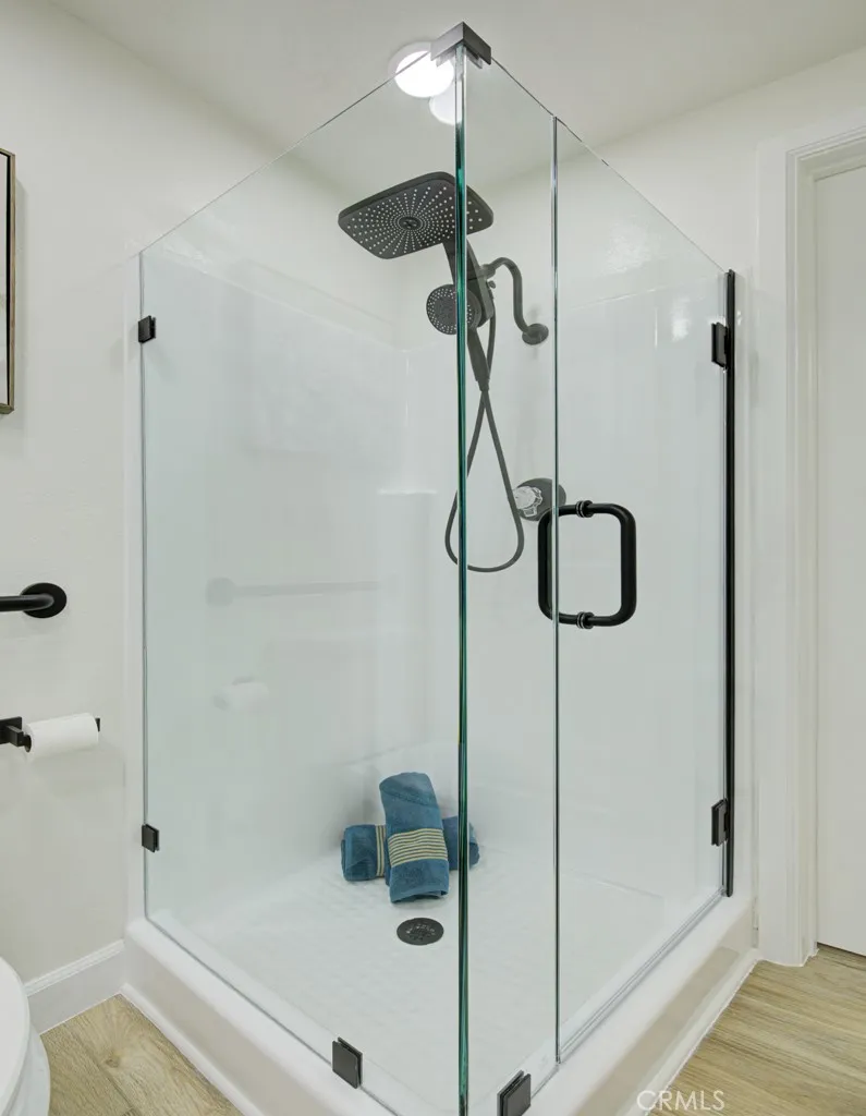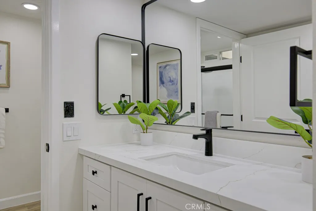 Welcome to 5499-2D Paseo Del Lago West a newly remodeled two-bedroom, two-bath, end-unit EL MIRADOR residence in the Laguna Woods senior community. Beyond a wrought-iron gate, double front doors open to a small entry foyer and the common rooms beyond. The enormous living room easily accommodates multiple configurations of large furnishings. The kitchen has brand new cabinetry (with lazy susan, spice drawer, built-in trash/recycling drawer and soft-close doors and drawers) and quartz countertops. The stainless-steel appliances are also brand new. The primary bedroom has a full wall of closet space with sliding glass doors. The primary bathroom has a tub/shower combo. The versatile guest bedroom could also serve as a home office, workout/yoga room or arts and crafts studio. The guest bedrooms window has a lovely view of endless trees and the Saddleback Mountains in the distance. The guest bathroom has a stall shower. The primary and guest bedrooms are at opposite ends of the residence affording increased privacy between the rooms. This home has been beautifully upgraded throughout. Features include smooth ceilings, recessed lighting throughout (all on dimmers), dual-pane windows and sliders and attractive vinyl plank flooring. The open covered balcony (accessible via a glass slider in the dining area) is ideal for year-round outdoor entertaining, dining and relaxing with friends and family. Convenient elevator access from the assigned parking space (with additional cabinet storage) in the subterranean garage to your front door. Common laundry facilities are available nearby.