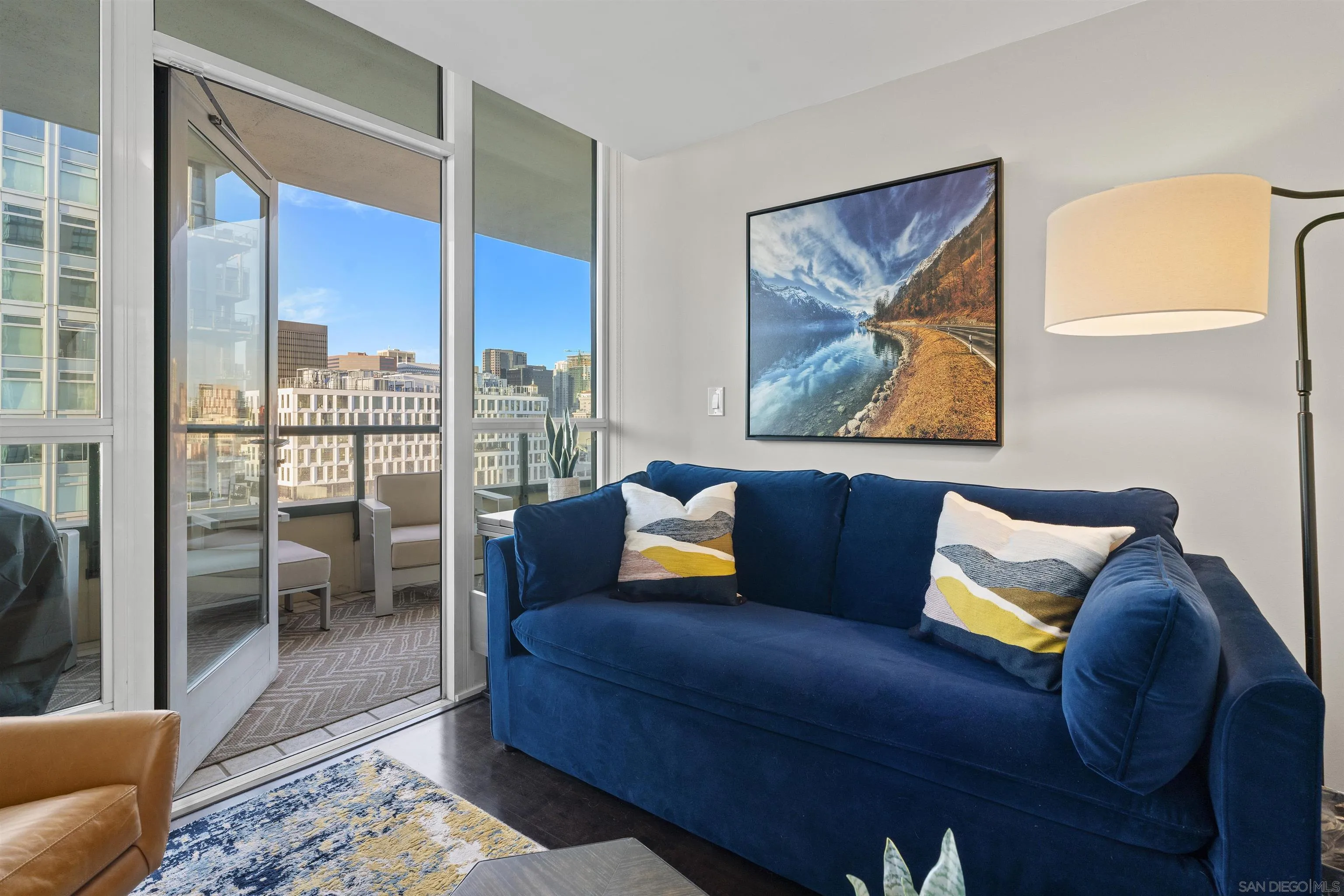 Enjoy stunning north-facing views of San Diego Bay and the Downtown skyline from this professionally designed 1-bedroom + den, 2-bath residence. Bright, open living spaces feature expansive windows and a spacious private patio ideal for indoor-outdoor living. The primary suite offers floor-to-ceiling windows, patio access, custom built-ins, a workspace, and an ensuite bath with dual sinks and a walk-in shower. A flexible den serves as a lounge or guest space with direct patio access. Offered fully furnished with designer pieces (approx. $30,000 value) from Arhaus, Pottery Barn, and Crate & Barrel, may be included at no additional cost and conveyed in current condition at close of escrow.