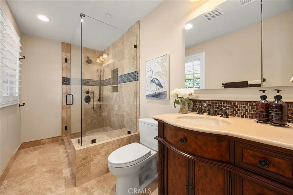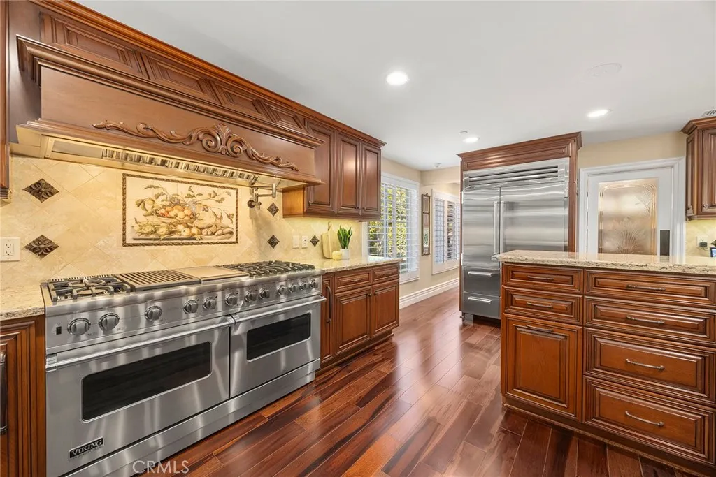 Welcome to a truly extraordinary estate homean unforgettable blend of luxury, craftsmanship, and refined design. Completely reimagined with the finest materials, this residence lives like a brand-new custom build. Brazilian walnut floors, Cambria Quartzite surfaces, and exquisite Cherry wood cabinetry elevate every space. The chefs kitchen is a masterpiece, showcasing an expansive island, generous storage, and premier appliances including a SubZero refrigerator, Viking professional range with dual ovens, Viking electric oven/microwave, dual Thermador dishwashers, two Perlick beverage centers, a Scotsman commercial ice machine, and three Wolf warming drawers. The kitchen opens seamlessly to the family room and dining area, creating an inviting environment for both intimate living and grand entertaining. Upstairs, the luxurious primary suite offers a cozy sitting area with a fireplace, a private balcony, a spa-inspired bath with a steam shower and soaking tub, and a spectacular walk-in closet. All additional bedrooms feature ensuite baths crafted with marble, granite, and travertine. A spacious bonus room, upstairs laundry, and flexible downstairs wingideal for a gym, guest quarters, office, or a potential ADUadd exceptional versatility. The backyard is an enchanting oasis, the product of a $500,000 investment. Surrounded by fruit trees and lush blooms, the resort-style pool, waterfall, spa, and firepit create a private paradise reminiscent of an English garden. This remarkable home must be experienced to be truly appreciated.