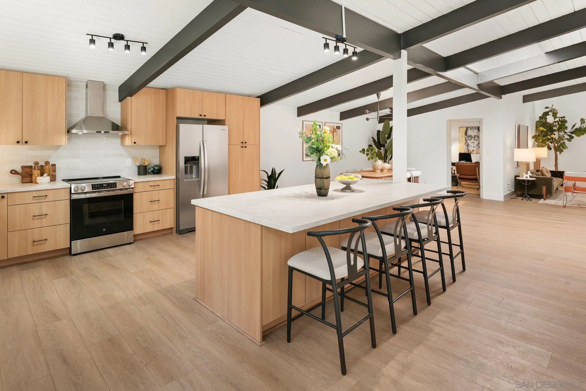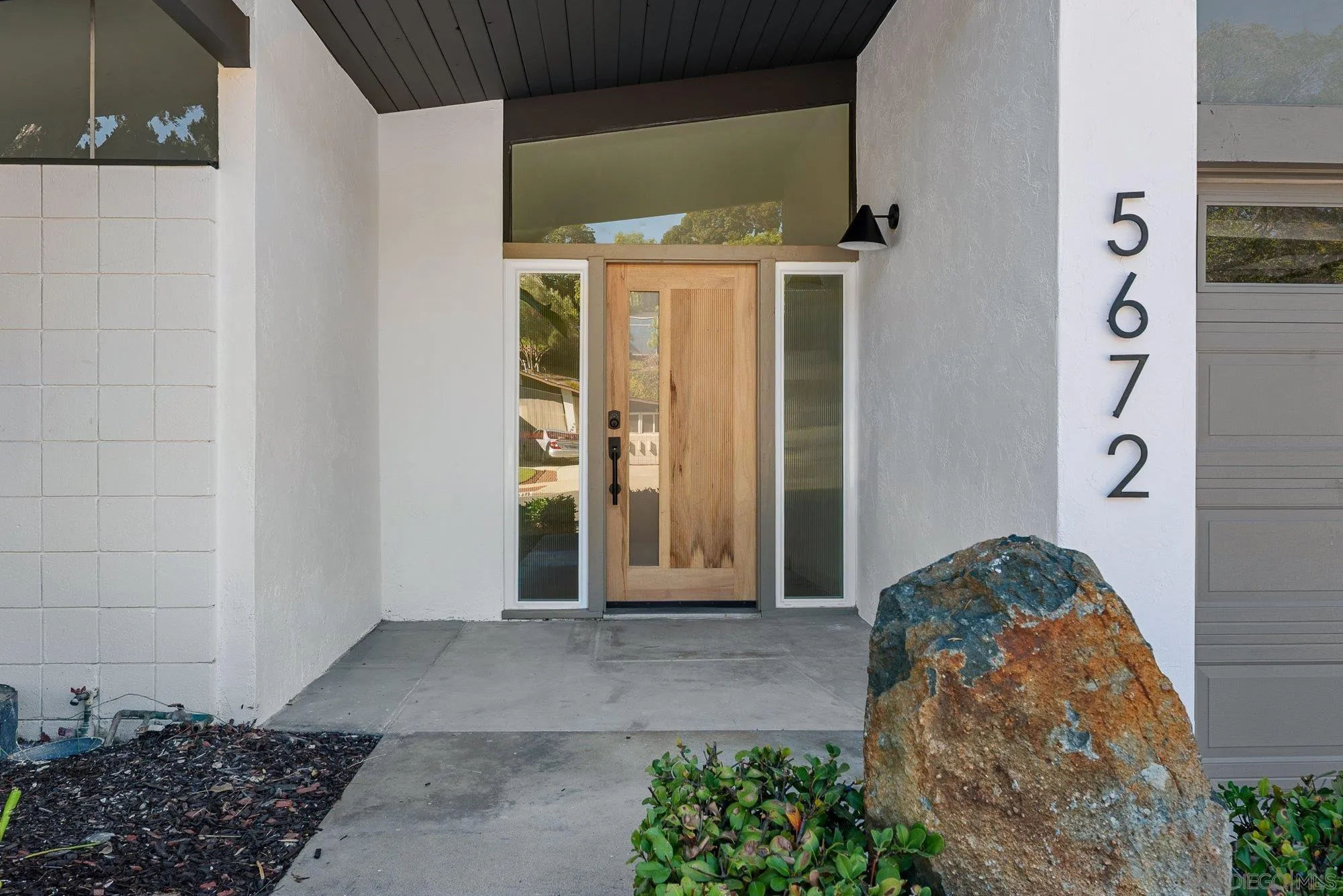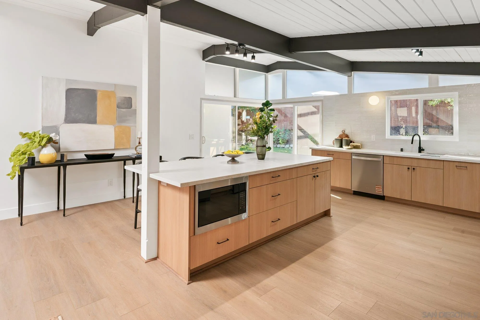 Authentic Mid-Century Modern, Reimagined with Integrity. Designed by renowned architect Leonard Drogin and thoughtfully remodeled by Maverick Design in partnership with Wedgewood Homes, this Del Cerro single-story residence is a true celebration of mid-century modern architecture. Every detail honors the era’s signature style—clean lines, clerestory windows, open beam ceilings, and an effortless connection between indoors and out. Natural light pours into this space, illuminating expansive living spaces anchored by a classic fireplace and framed by original architectural elements. The gourmet kitchen, surrounded by windows, is both functional and artful—perfect for those who appreciate design-driven living. Featuring four bedrooms plus an office, this home balances iconic style with everyday comfort. The primary suite offers a serene retreat with a massive walk-in closet and a beautifully updated en-suite bath. Both bathrooms reflect period-appropriate finishes reimagined for modern life. Outside, a large grassy yard and patio invite relaxed entertaining, while the block wall and clerestory façade create striking curb appeal that defines mid-century authenticity. Solar panels enhance energy efficiency without compromising design integrity. Set on a quiet cul-de-sac near top-rated schools and steps from a private park with pool and tennis courts (membership optional, waitlist may apply), this home is far from ordinary—it’s a true mid-century masterpiece for the discerning modernist.
