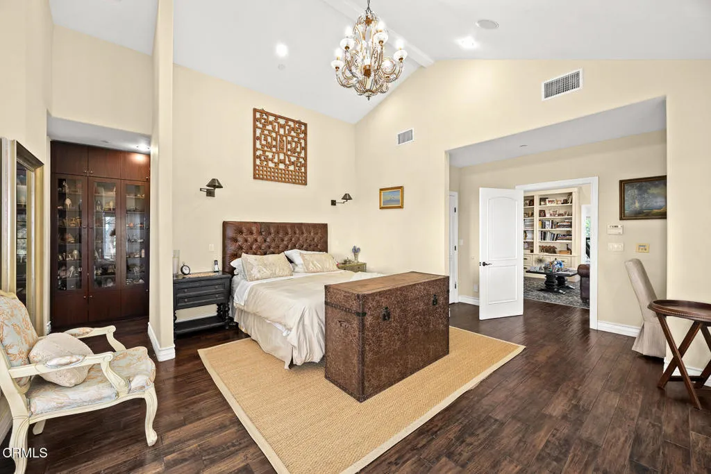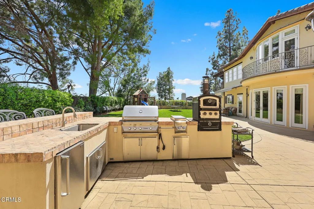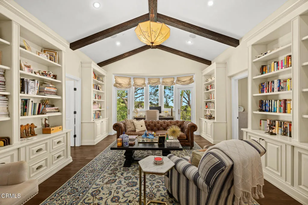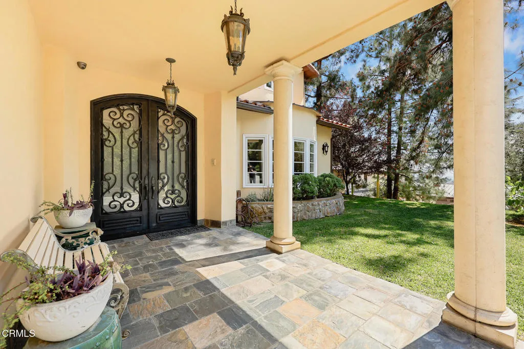 Welcome to this magnificent Mediterranean-style custom estate -- a rare gem nestled in the heart of Sierra Madre.As you enter through the impressive 8.5ft custom iron and glass double doors, you're greeted by a high-ceilinged entryway. The foyer leads into the heart of the main level: a chef's dream kitchen with an 8-burner Viking stove, built-in refrigerator and Sub-Zero wine cooler.Open to the eat-in kitchen is the living room, complete with a wood-burning fireplace and bespoke built-in cabinetry for television and immersive sound AV components.The formal living room features a second wood-burning fireplace with a distinctive marble mantle. This elegant space flows into the formal dining room. The high ceilings throughout contribute to the grand and airy feel.The first floor also includes a guest suite, a powder room, and a versatile bonus room.Ascend the grand, curved staircase to the home's upper level. There, you're welcomed by a stunning custom library with vaulted and beamed ceilings with two built-in Spanish-style desks. The curved balcony just outside the library offers sweeping views of city lights, treetops, and mountains.The primary suite - also with vaulted ceilings - serves as a retreat, featuring a walk-in dressing room with double doors leading to an en-suite bath. The primary bath boasts a Kohler jetted tub, a large rain shower, and a Toto Washlet. The suite also opens to a private balcony.Upstairs you'll also find a private home gym, complete with yet another balcony. Two additional bedrooms with walk-in closets, a full bathroom with double vanities, and a