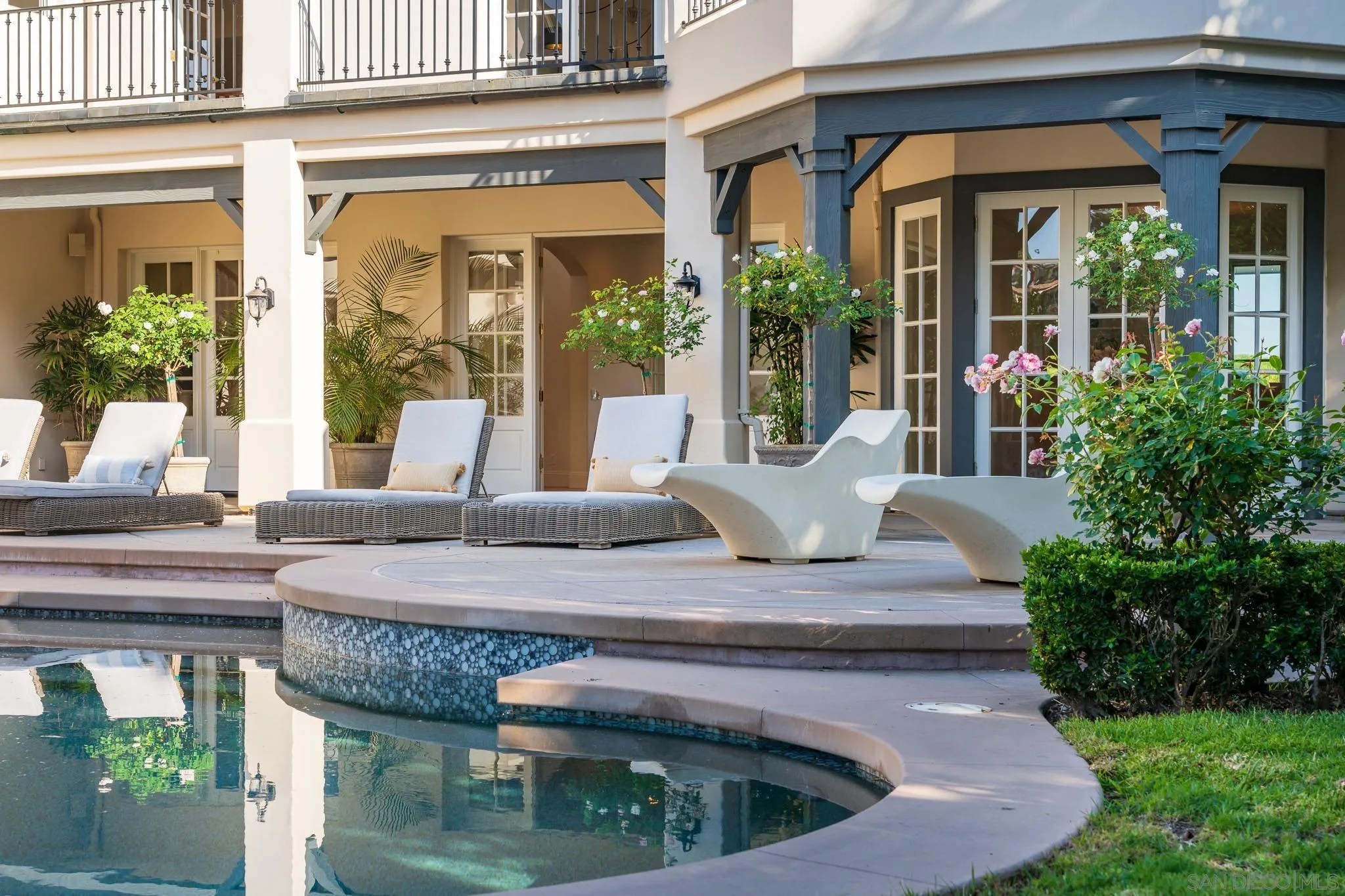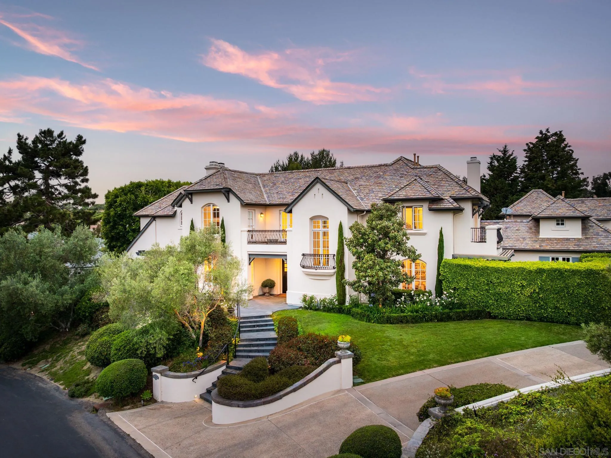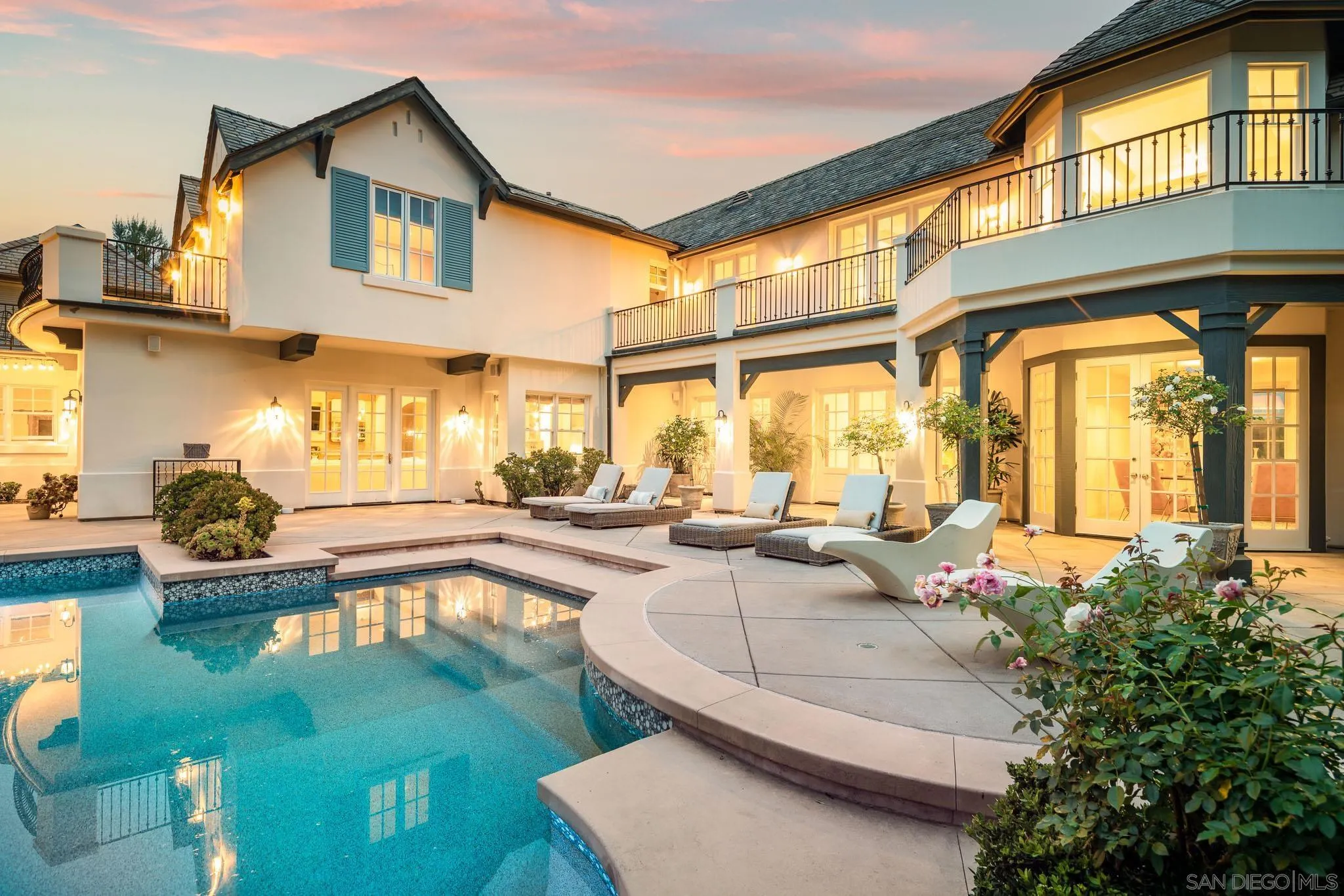 Welcome to this elevated estate—an artfully updated traditional-meets-modern French-inspired country estate tucked away on a private cul-de-sac along the 11th fairway of the prestigious Del Mar Country Club. Situated in one of San Diego’s most exclusive guard gated communities, this home offers timeless architecture, lush resort-style grounds, and refined living spaces designed for both comfort and sophistication. Impeccably maintained and thoughtfully upgraded, the main residence features 6 bedrooms, 6 full bathrooms, and a dedicated home office, blending classic design elements with modern luxury. Rich hardwood flooring, hand-carved fireplace mantels, limestone and marble accents, and custom millwork lend an air of understated elegance throughout. The newly 2025 reimagined gourmet kitchen serves as the heart of the home, equipped with top-of-the-line Thermador appliances and striking marble countertops. A rare highlight is the attached guest cottage, complete with its own kitchen, full bathroom, and private deck. Step outside to your own private backyard sanctuary, where lush landscaping, slate patios, and a custom PebbleTec pool and spa set the tone for luxurious outdoor living. Featuring a covered gazebo with a fireplace and TV—perfect for movie nights, sports games, or relaxed evenings by the fire. As a member of Del Mar Country Club, you'll enjoy exclusive access to a championship golf course, tennis courts, fitness center, and fine dining, all within a secure, guard-gated community.