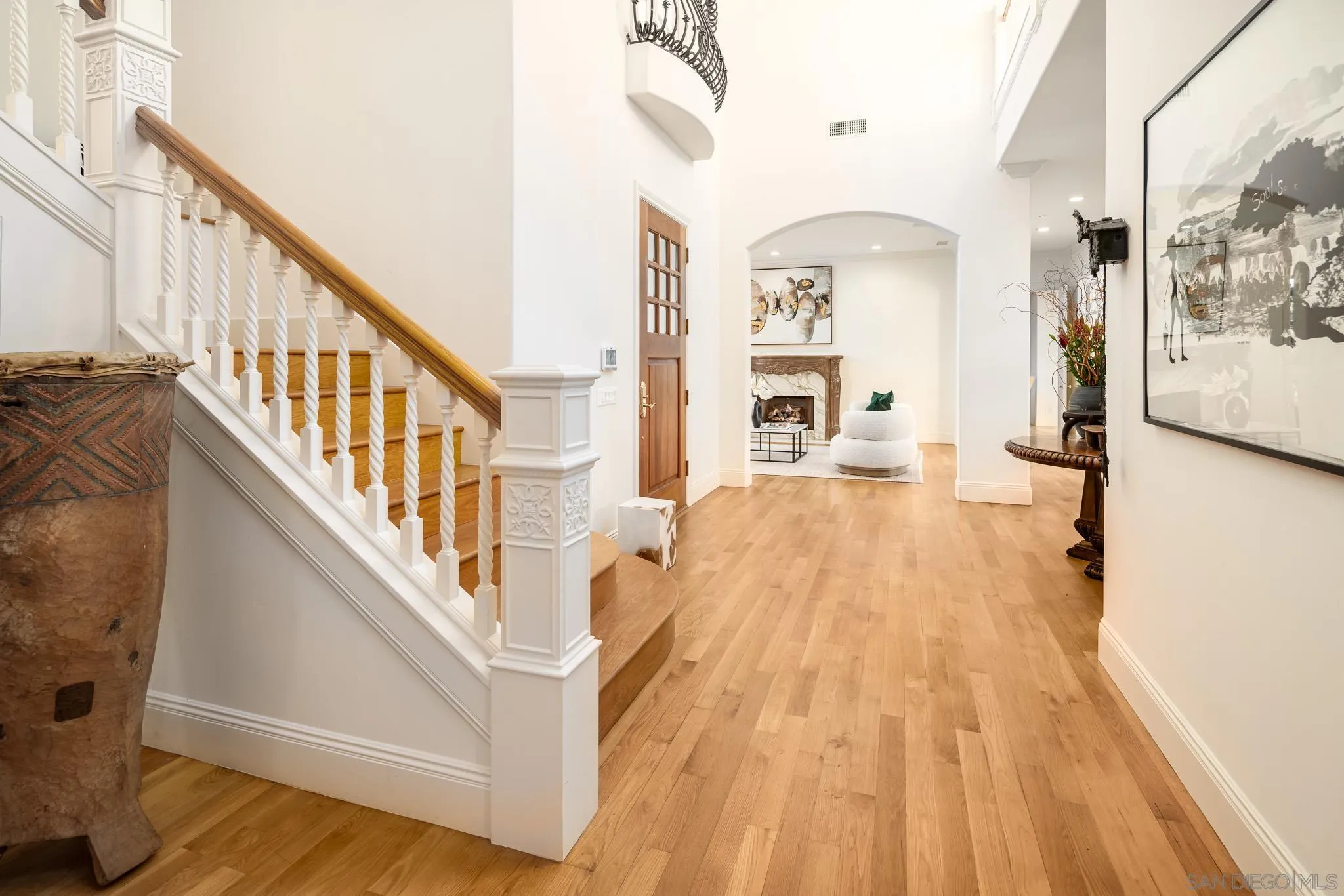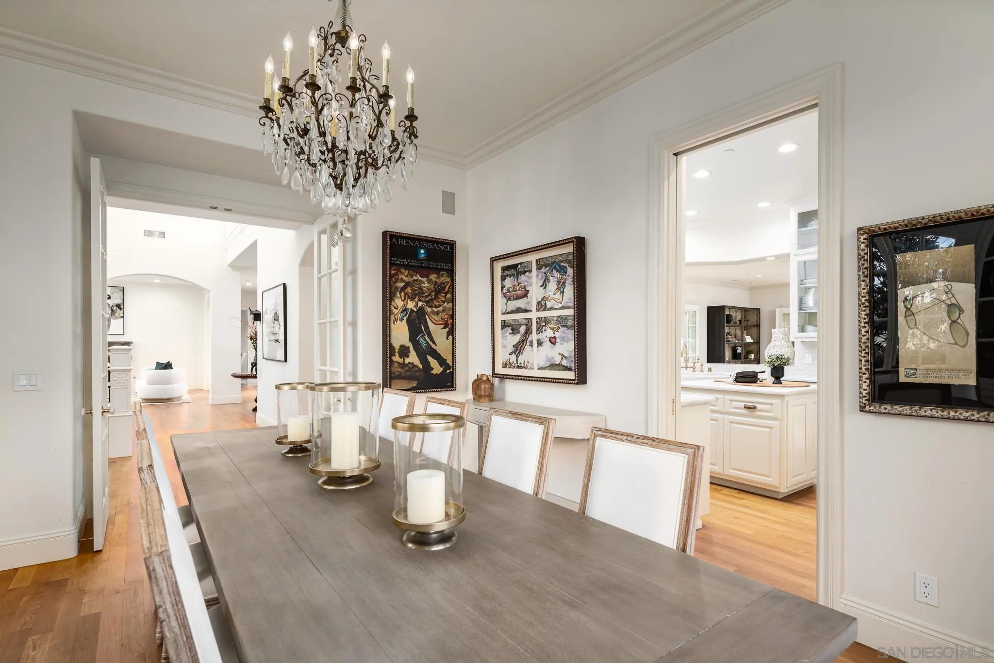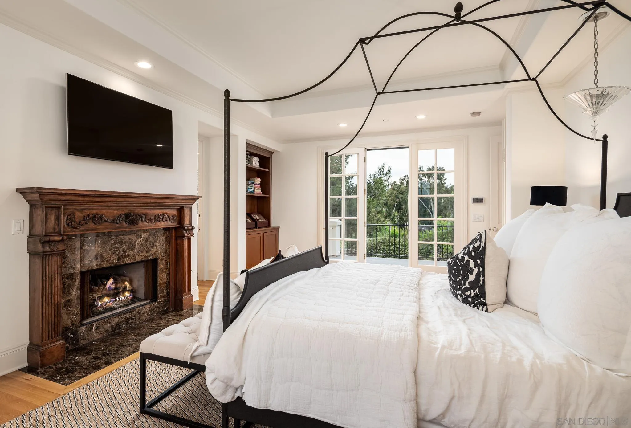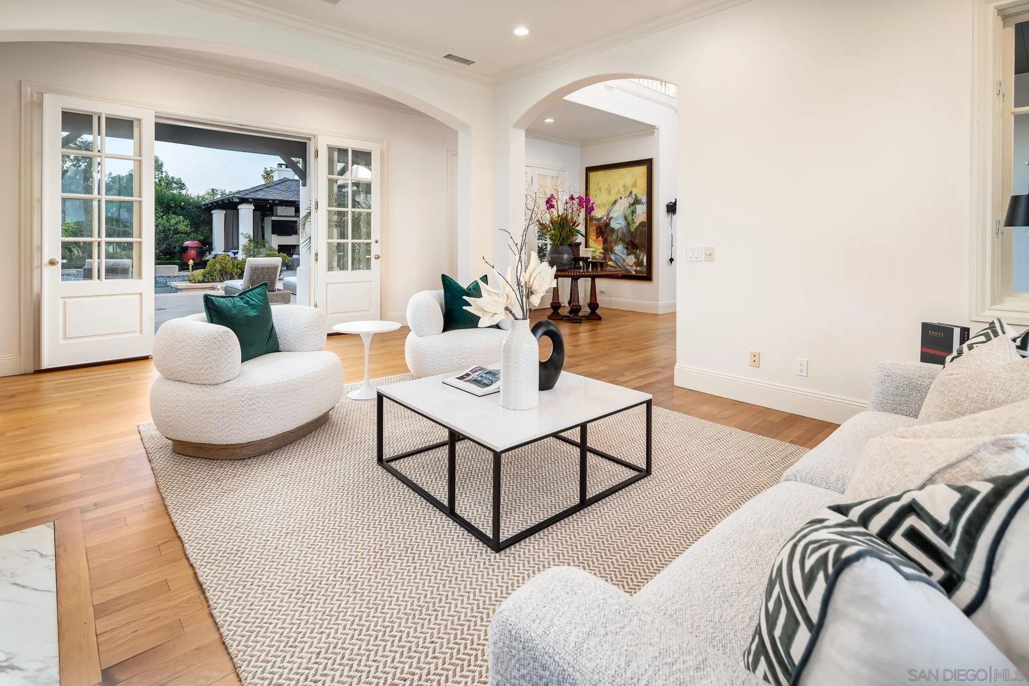 Welcome to this elevated estate—an artfully updated traditional-meets-modern French-inspired country estate tucked away on a private cul-de-sac along the 11th fairway of the prestigious Del Mar Country Club. Situated in one of San Diego’s most exclusive guard gated communities, this home offers timeless architecture, lush resort-style grounds, and refined living spaces designed for both comfort and sophistication. Impeccably maintained and thoughtfully upgraded, the main residence features 6 bedrooms, 6 full bathrooms, and a dedicated home office, blending classic design elements with modern luxury. Rich hardwood flooring, hand-carved fireplace mantels, limestone and marble accents, and custom millwork lend an air of understated elegance throughout. The newly 2025 reimagined gourmet kitchen serves as the heart of the home, equipped with top-of-the-line Thermador appliances and striking marble countertops. A rare highlight is the attached guest cottage, complete with its own kitchen, full bathroom, and private deck. Step outside to your own private backyard sanctuary, where lush landscaping, slate patios, and a custom PebbleTec pool and spa set the tone for luxurious outdoor living. Featuring a covered gazebo with a fireplace and TV—perfect for movie nights, sports games, or relaxed evenings by the fire. As a member of Del Mar Country Club, you'll enjoy exclusive access to a championship golf course, tennis courts, fitness center, and fine dining, all within a secure, guard-gated community.