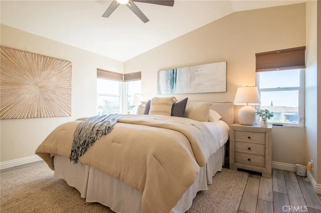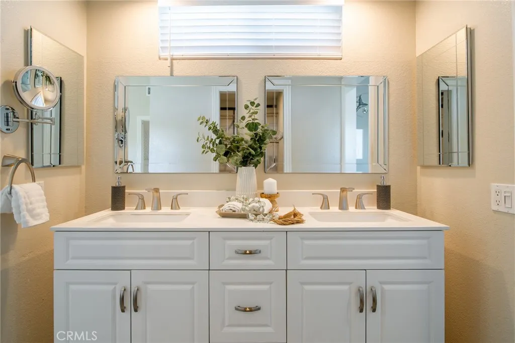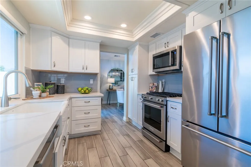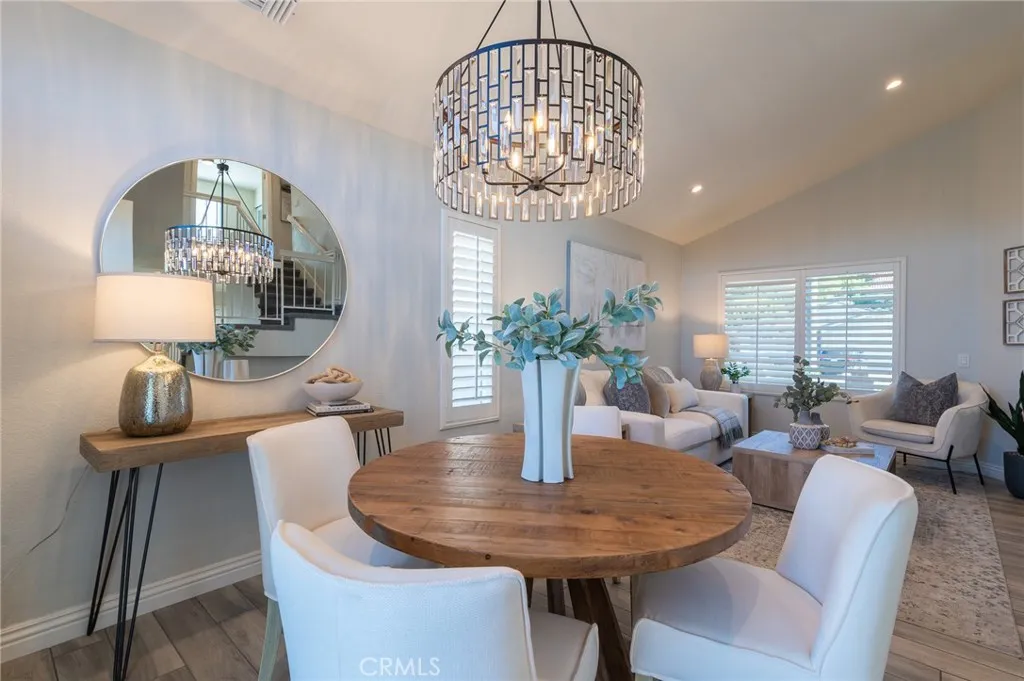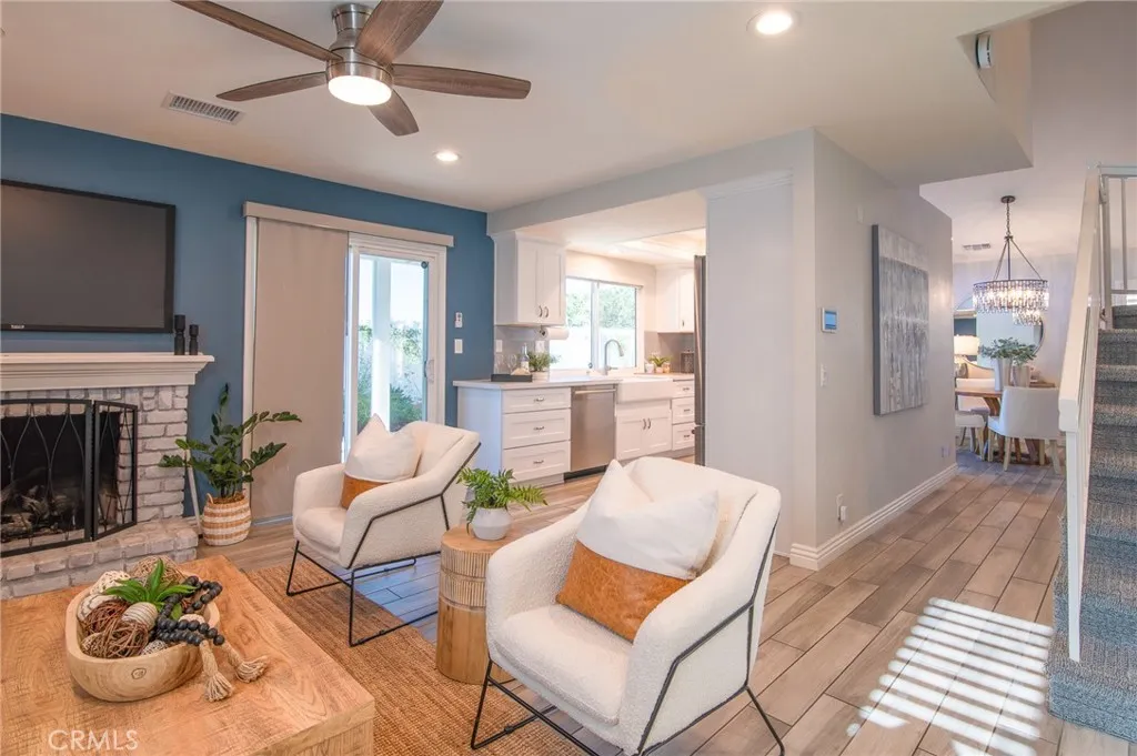 Welcome to this beautifully upgraded 4-bedroom, 3-bath home in the heart of Rancho Santa Margarita. The living room and dining room feature a vaulted ceiling, recessed lighting, plantation shutters, and a stunning chandelier, creating an inviting space for both everyday living and entertaining. Wood-look tile flooring flows throughout the main level. The updated kitchen offers white mission-style cabinetry, beautiful countertops, a farmhouse sink, and stainless steel appliances including a 5-burner KitchenAid range and Bosch dishwasher. It opens to the inviting family room with a fireplace, ceiling fan, and recessed lighting. The downstairs bath has been tastefully upgraded with matching mission-style cabinetry and finishes. Upstairs, the spacious primary suite features a vaulted ceiling, ceiling fan, and a bright, open feel, along with a beautifully upgraded primary bath showcasing a dual vanity, glass-enclosed shower, and a walk-in closet. The upper level also includes three additional bedrooms and an upgraded guest bath, offering comfortable space and flexibility for family, guests, or a home office. Enjoy the private backyard and side yard featuring an Alumawood patio cover with a ceiling fan and lighting, a storage shed, and beautifully landscaped grounds with vibrant color. Additional highlights include dual-pane vinyl windows and sliding doors, a newer water heater and FAU/AC system, PEX repiping, an alarm system, synthetic turf in the front yard for easy maintenance, and a 2-car attached garage with built-in cabinets and a dedicated laundry area. Residents enjoy Ran