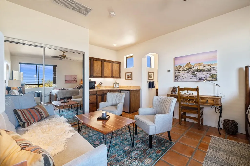 Perched on 2.5 private acres overlooking the Coachella Valley, this Spanish-style mountain retreat offers breathtaking views, privacy, and a peaceful connection to nature. Surrounded by natural beauty, the property provides easy access to scenic hiking and biking trails, a dog-friendly neighborhood, and quiet moments under star-filled mountain skies. The main residence features two bedrooms, three full bathrooms, and a spacious office that could easily serve as a fourth bedroom if desired. The moment you step inside, the home welcomes you with warmth and thoughtfully curated dcor, creating an inviting atmosphere that perfectly complements the mountain setting. The property is being offered turnkey furnished, allowing the next owner to move in and immediately enjoy the lifestyle it offers. Classic Spanish architectural details including Saltillo tile flooring, wood-beamed ceilings, and fireplaces in both the living room and the primary suite add character and charm throughout. The spacious gourmet kitchen provides ample room for cooking, gathering, and entertaining. Additionally A detached casita adds flexibility with its own full kitchen, full bathroom, and private courtyard, ideal for guests or extended stays. Outdoor living is a highlight of the property, featuring a private pool, separate spa, yoga gazebo, hammock area, and multiple patios designed for relaxing or entertaining while enjoying the surrounding mountain and valley views. Expansive seating areas create the perfect setting to take in the dramatic desert sunsets. Located just 20 minutes from the dining and shop