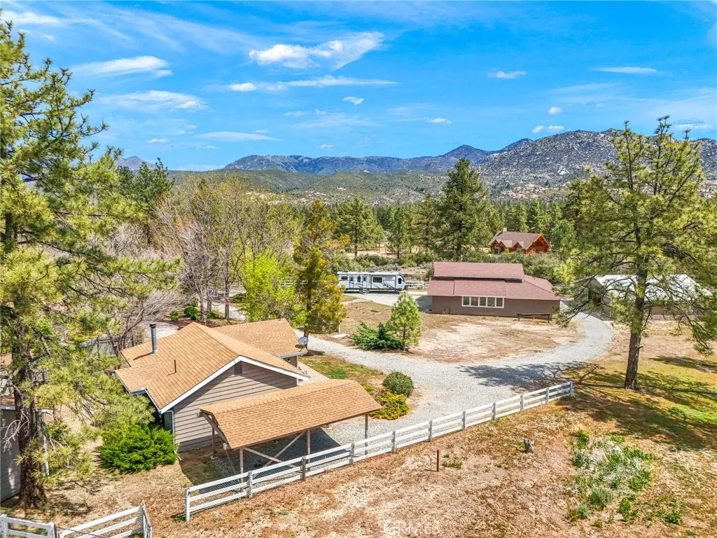 A rare and versatile mountain estate set in the scenic setting of Mountain Center in Garner Valley. This meticulously maintained property sits on a flat, fully fenced parcel offering exceptional privacy, usability, and flexibility. Comprised of five separate structures thoughtfully positioned and connected by winding walkways through manicured landscaping, the estate creates a peaceful, park-like environment ideal for a wide range of lifestyles. The main residence is filled with natural light and features two bedrooms, two bathrooms, a living room, kitchen, and laundry area. Expansive windows and sliding glass doors open to a spacious covered porch with a built-in pizza oven, designed for seamless indoor-outdoor living and entertaining. A separate one-bedroom guest house includes one bathroom, a living room, full kitchen, laundry, and private entrance, providing comfortable accommodations for extended stays or other permitted uses. Nearby, a climate-controlled art and craft room with heating and air conditioning offers a flexible space suitable for year-round fitness, creative use, or additional hobbies. A substantial approximately 3,400 square foot former workshop has been thoughtfully converted into a versatile living space. This structure includes two full bathrooms, a loft-style bedroom, and two additional downstairs rooms, allowing for a variety of configurations. An additional room may be used as a workshop, craft space, or storage. Equestrian amenities include a six-stall barn and a fully fenced turnout. A separate fully fenced yard offers space suitable for small fa