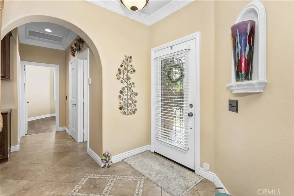 Where Views, Upgrades & Lifestyle Meet Exceptional Golf Course Home!! From the moment you arrive, this beautifully upgraded Magnolia model impresses with a hand-crafted textured concrete driveway and walkways, manicured landscaping, and a tranquil front fountain. Beyond the wrought-iron gate, a private courtyard with sitting area, grass, and direct doggie door access offers a peaceful and functional outdoor space. Inside, the high-end, fully remodeled interior showcases new luxury vinyl tile flooring in the living room and bedrooms, tile flooring in the kitchen, dining, and baths, and mosaic tile in the foyer and hallways. Elegant finishes include crown molding, plantation shutters, recessed lighting, custom arched entries, and a see-through gas fireplace with custom built-in entertainment center. The open-concept kitchen features KitchenAid gas oven & cooktop, KitchenAid refrigerator/freezer with dual drawers, granite countertops, tile backsplash, and custom cabinetry throughout. Matching upgrades continue into the bathrooms with beautifully tiled showers. The primary suite offers dual closets, including a walk-in and secondary closet with direct laundry room access, plus tall French doors leading to a private sitting area with stunning golf course views. Additional features include Samsung washer & dryer, 16-SEER HVAC system, 220V outlet for spa, and garage with built-in cabinets, overhead storage, and golf cart space. The backyard is ideally positioned on Hole #14 with unobstructed golf course and mountain views, and a large covered patio with insulated cover, lighting,