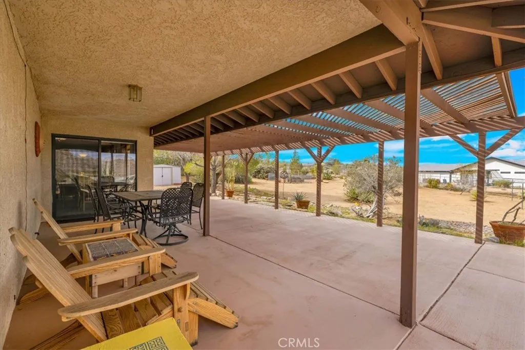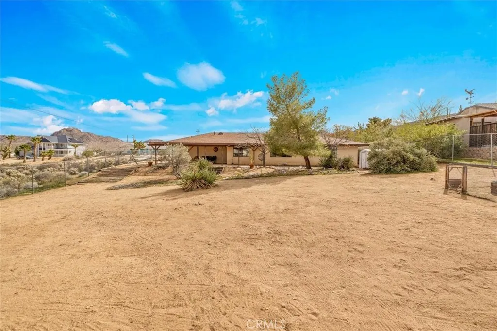 Beautiful home with 1500 square feet of well-planned space, granite countertops in kitchen and baths, and expansive territorial views. The open layout flows easily into the dining and living areas, where large windows frame the surrounding landscape and bring in natural light. Two bedrooms, 2 baths, with overhead fans in both bedrooms and above the dining area add comfort, along with central AC and heating, an up-duct evaporative cooler, and a newer heat pump. Dual pane windows provide energy efficiency throughout. Newer stove and dishwasher in kitchen. The primary suite includes natural wood closet doors and a remodeled bathroom with granite counters and a glass-enclosed shower. The guest bath has also been updated with granite countertops, continuing the cohesive finishes throughout the home. Outside, mature desert landscaping, established trees, and fencing create a private setting. The covered patio offers space to relax, entertain, or simply take in the expansive sky and distant views. A storage shed adds functionality, and the property is serviced by propane. Located just minutes from Joshua Tree National Park, the Joshua Tree Lake Campground, local hiking trails, and the vibrant art and music scene of downtown Joshua Tree, this home offers the opportunity to enjoy both quiet desert living and easy access to the areas outdoor recreation and community events. Almost half acre lot in quiet neighborhood. A well-maintained view home in one of Joshua Trees sought-after neighborhoods.