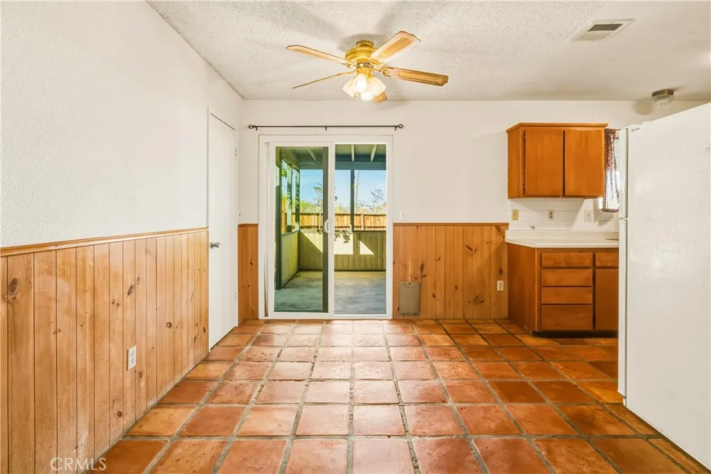Adorably Vintage with Sustainable Soul -- 61948 Calle Las Sierras, Joshua Tree, CA -- Step into desert charm at its most authentic. This lovingly maintained Joshua Tree home radiates retro warmth and timeless appeal with sustainable modern comforts that make it both cozy and smart. Inside, rich wood paneling lines the living room walls, creating a golden glow that feels like a hug from the past. The dining room and a bedroom feature classic wood wainscoting, adding texture and charm, while Saltillo tile floors in the entry, dining, and kitchen offer a touch of rustic desert romance. The original wood kitchen cabinets are beautifully preserved a rare find. The home has been freshly painted throughout and all three bedrooms have brand new ceiling fans! Youll find functional storage everywhere: Two oversized linen closets in the hallway, a coat closet at the entry, a large food pantry off the kitchen, and an attached single-car garage. Outside, the desert lifestyle shines. A covered front porch with pony walls and a whimsical entry gate welcomes you home, while the double covered back patio invites endless creativity and relaxation. The patios half-wall separation with a tiled counter and swinging door creates a natural space for entertaining from outdoor dining to an impromptu dry bar. One section was once a screened "catio" (complete with a pet door entry from the dining room), perfect for your furry companions. This property is built for efficiency: 16 fully paid solar panels, rainwater collection system for garden watering, compost stacks and water-wise landscaping, and