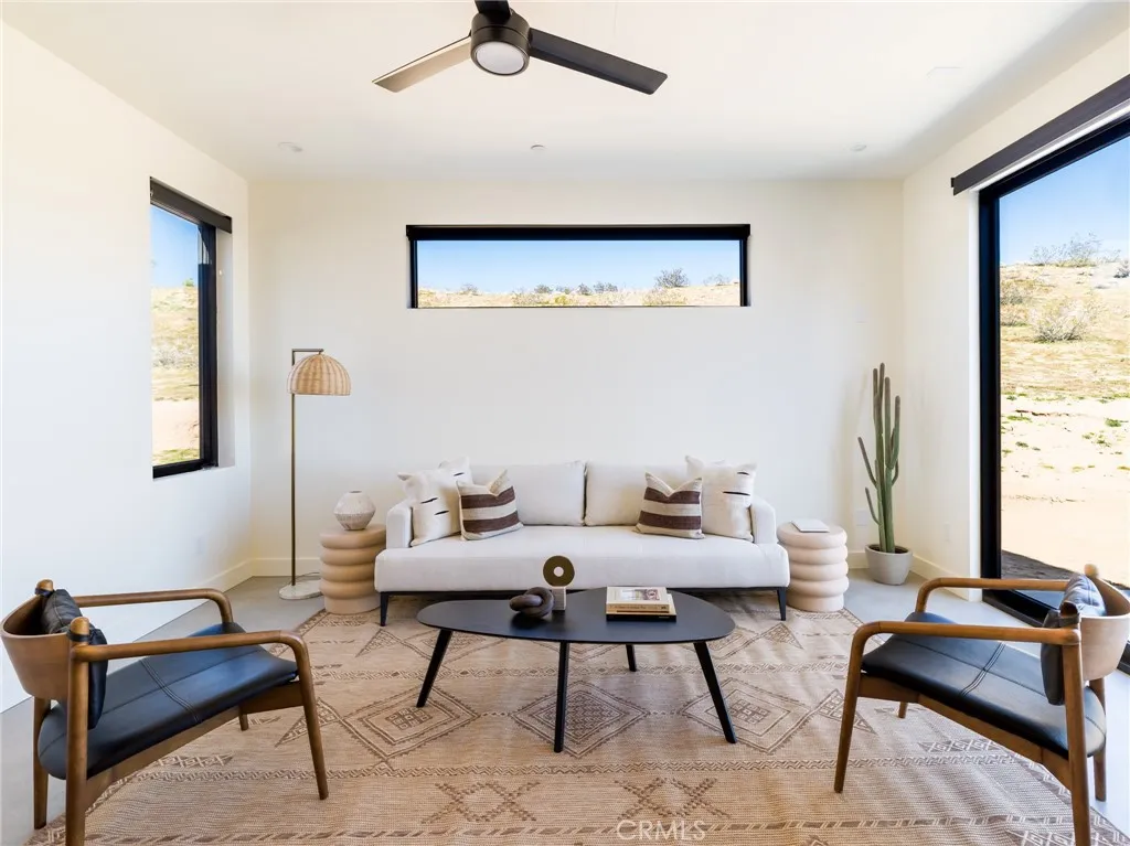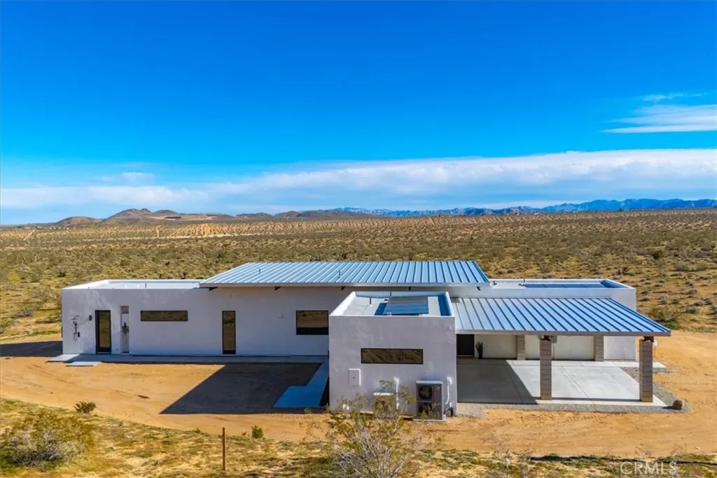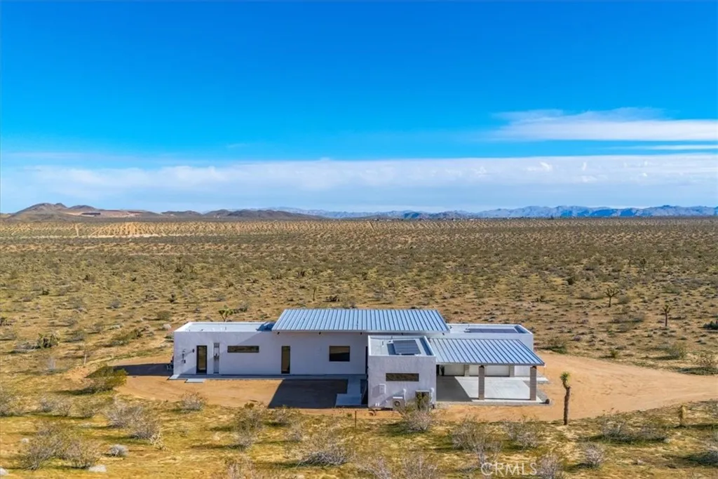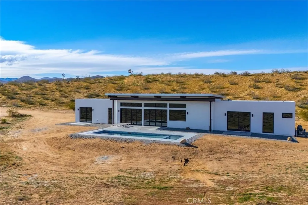Wide open desert views and ultimate seclusion! This newer construction property includes a 2 bedroom, 2 bath contemporary home with a detached studio casita. It sits on a massive parcel of land, approximately 18.15 acres just outside the area of Flamingo Heights in Yucca Valley, offering expansive desert and mountain views in every direction. With 2286 square feet of single-level living space, the home features polished concrete flooring throughout, clerestory windows, and oversized sliding glass doors that open directly to the pool deck. The open living and kitchen areas are oriented toward wide desert vistas, creating a strong connection between interior and landscape. Attached to the carport is also a beautiful casita with it's own bathroom and kitchenette perfect for additional space for guests. Zoned mini split systems provide efficient heating and cooling, complemented by recessed lighting and modern ceiling fans. Clean stucco walls and low-slope metal rooflines reflect a refined desert modern aesthetic. Outside, a rectangular in-ground pool with integrated spa is positioned to capture unobstructed views. The property includes owned solar, public water, septic system, and covered carport parking. No HOA. Short-term rentals are allowed (buyer to verify local regulations), offering flexibility for personal use or income potential. Built new in 2024, completed in 2026, and set on over 18 acres, this property offers space, privacy, infrastructure, and contemporary design within reach of Yucca Valley amenities and Joshua Tree National Park. *Seller owns additional contiguo