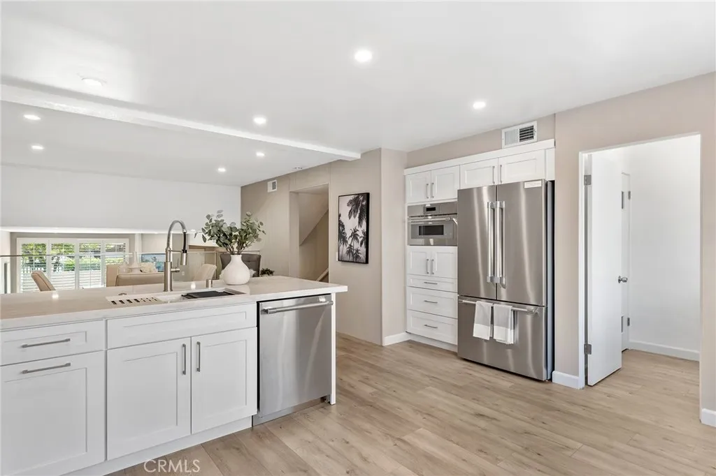 Stunning, completely remodeled almost 1,900 SF Villa Valencia townhome with attached 2-car garage with direct access! Located in the heart of Warner Center adjacent to dining/shopping at the Westfield Mall & Village, shops and eateries off Topanga Canyon, and minutes to the beach with easy freeway access. Boasting the largest floor plan in the complex, this thoughtfully renovated townhome greets you with a private gated courtyard with Spanish Saltillo and patterned tile flooring. Step inside where youll find a formal entry with coat closet with new wide plank luxury vinyl flooring found throughout. The entry opens to the spacious sunlit living room featuring fireplace and large glass sliding door that leads out to the front patio. The remarkable chefs designer kitchen has been completely remodeled boasting real quartzite stone countertops, soft close cabinetry, breakfast bar seating, and a Thermador stainless appliance suite including built-in range with oven/stove, fridge, microwave, and dishwasher. The kitchen opens to the separate formal dining room with sleek modern glass railing which overlooks the living room. This level also has a convenient guest powder bathroom and separate laundry room with storage cabinets. Upstairs you will find two oversized bedroom suites. The primary bedroom has a double door entry, large wraparound closet with built-ins plus additional walk-in closet, and private en-suite upgraded bathroom with dual sinks, walk-in shower, and separate bathtub. The second bedroom suite could also serve as den/bonus room featuring double door entry, high vault