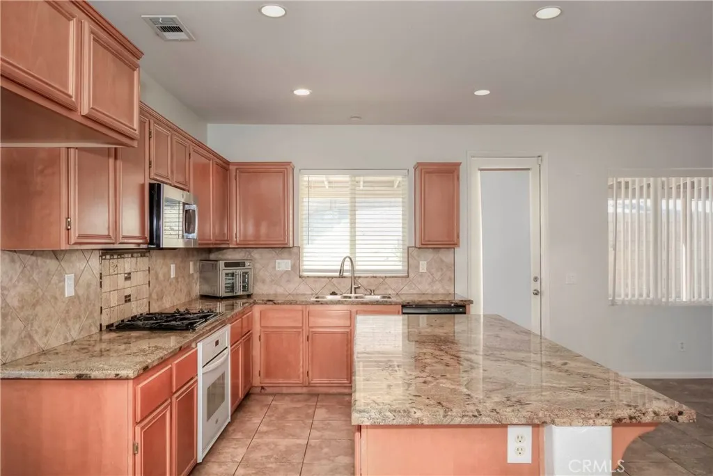 Discover this stunning SINGLE STORY home nestled in the sought-after Skyborne community of Desert Hot Springs. The residence features three bedrooms, two and a half bathrooms, and a two-car garage. The flex room is being used as a dining room and it can be also used as a living room or an office, while the expansive kitchen boasts elegant granite countertops, a large island with bar seating, ample cabinet space, and a built-in desk. The kitchen flows into the family room, complete with a cozy fireplace, ideal for family gatherings. Enjoy recessed ceiling lights, ceiling fans, high ceilings, premium tiles thru out the house. A French door leads from the kitchen to the backyard. The primary suite includes a spacious bedroom, walk-in closet, and a bathroom with dual sinks, a separate walk-in shower, and a bathtub. Two additional well-proportioned bedrooms are included. The covered patio offers additional space, perfect for outdoor entertainment. The laundry room's convenient location near the garage adds to the home's thoughtful layout. Drought resistant backyard with solid patio cover. Skyborne community amenities enhance the living experience with a community pool, BBQ areas/parks, a dog park, and private gates. Close proximity to Palm Springs, restaurants, shopping, casinos, and entertainment.