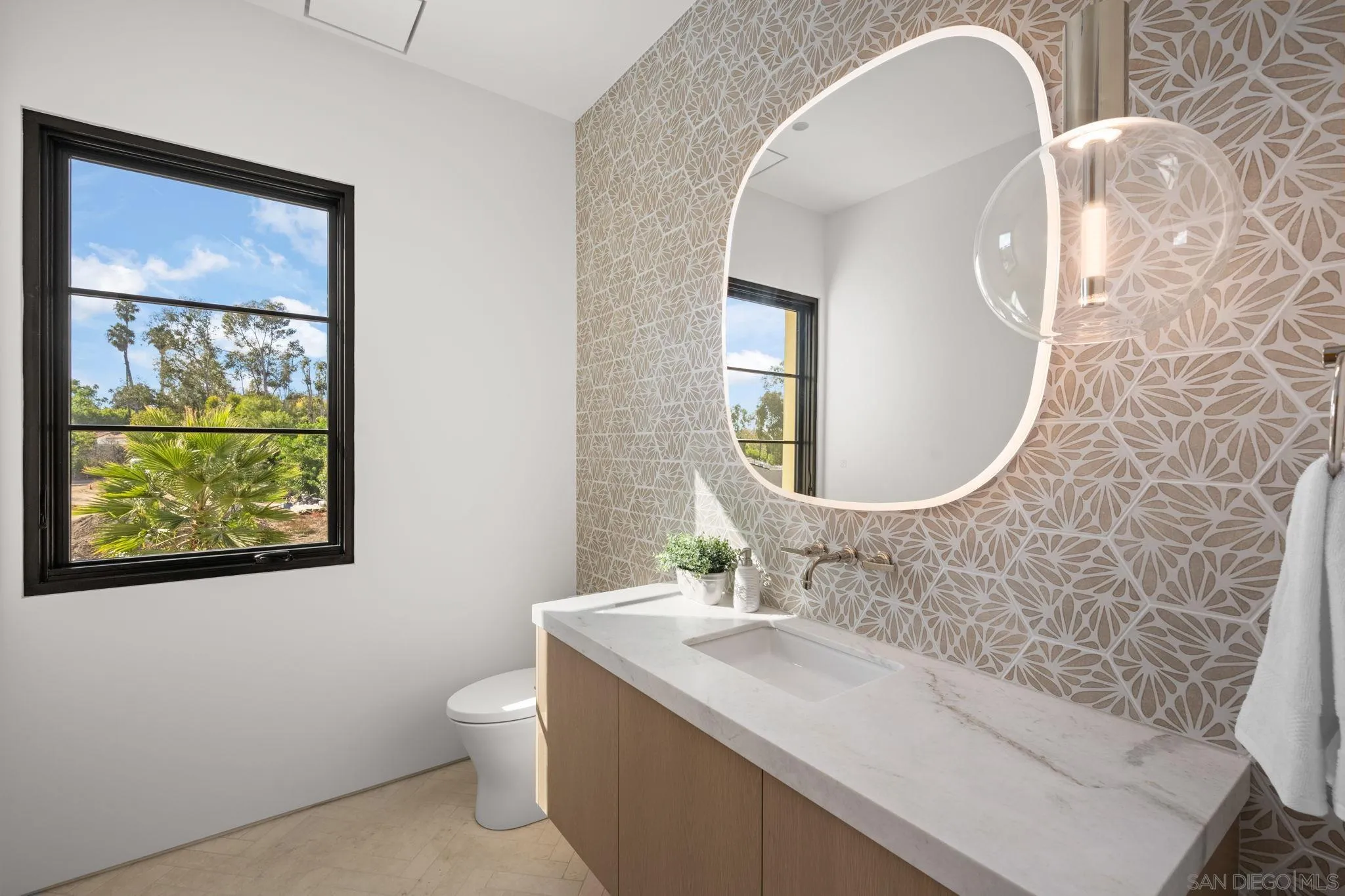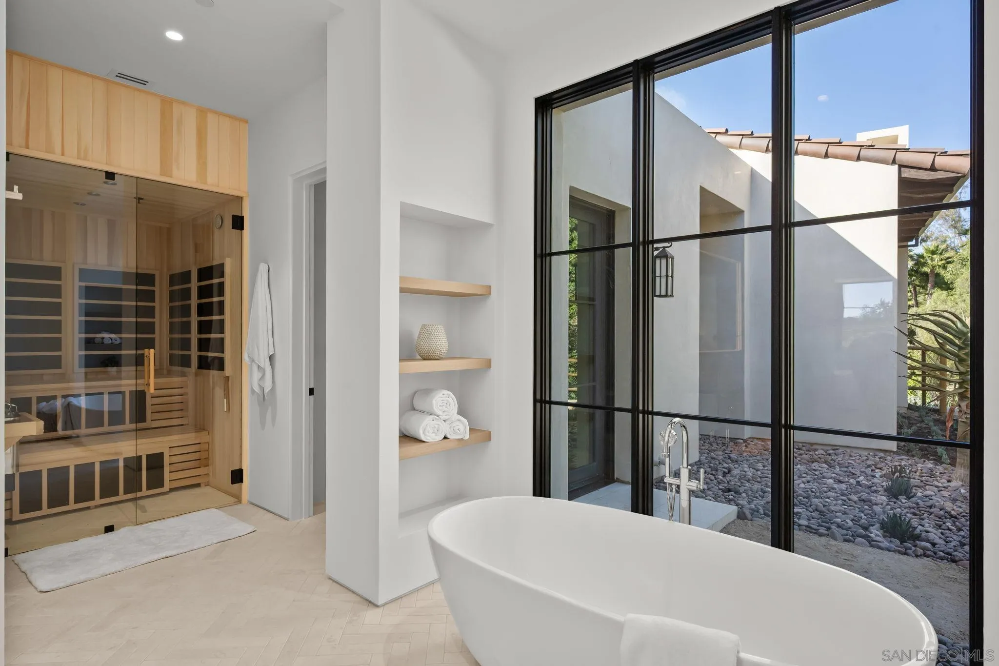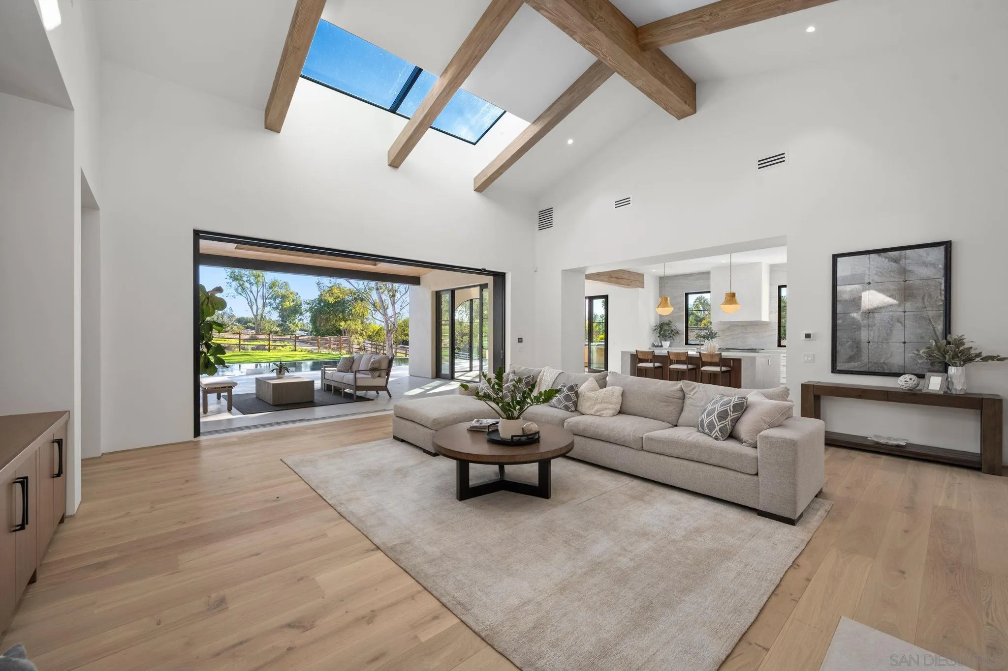 Brand-New, Custom Construction by master builder Greg Agee. 6323 Mimulus in Rancho Santa Fe Covenant will capture you immediately and is positioned on one of the most desirable streets. Set on a beautiful & usable lot with wide fairway views, direct access to the Covenant's 60 miles of walking/running trails with mature oak plus sycamore trees. Inside, European white oak floors and abundant natural light create a calm, refined atmosphere, while Sonos surround sound with invisible speakers add to the ambience. Custom detailing such as museum lighting with invisible trims in primary entrance spaces, accent lighting by top designers Kelly Wearstler and Aerin Lauder are displayed in the great room, kitchen, and bedroom suites. Fireside great room designed with dramatic wood beams open through expansive sliding doors to an outdoor living area complete with skylights, fireplace and flush mount ceiling heaters blending seamlessly with the wet-edge saltwater pool/spa, outdoor firepit and lush turf area designed for lounging overlooking the golf course. The designer kitchen offeres a wall of sleek walnut cabinetry, slab poplar white Quartzite, Subzero refrigerator, Wolf appliances including steamer & 48" full gas range plus back kitchen/pantry. The sumptuous primary suite offers a tranquil retreat with Steam shower with skylight, Infrared Sauna, custom LED mirrors, and a private patio with hook up for Cold Plunge. Additional amenities include 4K home Movie Theater, game room with wet bar, gym, owned Solar, Race fuber internet, 4-car and private motor gated entry.
