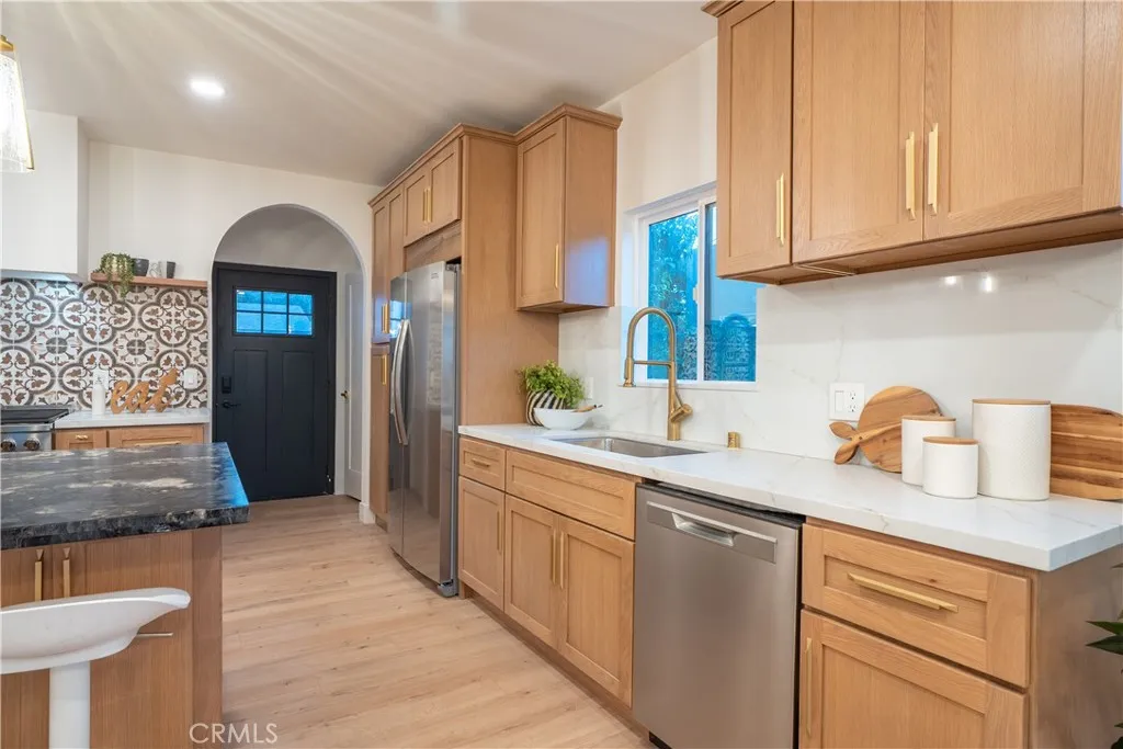 Step into an architectural gem where old-world charm meets curated modern finishes. From the moment you arrive, the Spanish/Mediterranean Revival faade captures that classic Los Angeles character clean lines, and an inviting presence that feels both warm and iconic. Beyond the private gate, youre welcomed into a bright and airy interior where a thoughtfully designed open floor plan unfolds. The foyer sets the tone, leading into a seamless living and dining space filled with natural light and elevated by carefully curated finishes throughout. At the heart of the home, the kitchen and living area come together effortlessly. Sculptural curved dry bars add a distinctive design element. Perfect for a wine bar or coffee station while the leather-finished marble island creates a stunning focal point. Stainless steel appliances, paired with a sleek microwave drawer, bring both function and modern convenience to the space, making it ideal for everyday living and entertaining alike. Each bedroom is generously sized, offering comfort and flexibility, while the primary suite serves as a true retreat. The spa-inspired bathroom features a standalone soaking tub, double vanity, and a layout designed for relaxation and ease. Set on a spacious lot, the property is secured by a private electric gate, offering both privacy and peace of mind. A detached three-car garage adds incredible versatility, complete with an RTI permit for conversion into a 2-bedroom, 1-bath ADU ideal for additional income, a guest suite, or multigenerational living. Centrally located with convenient access to major fre