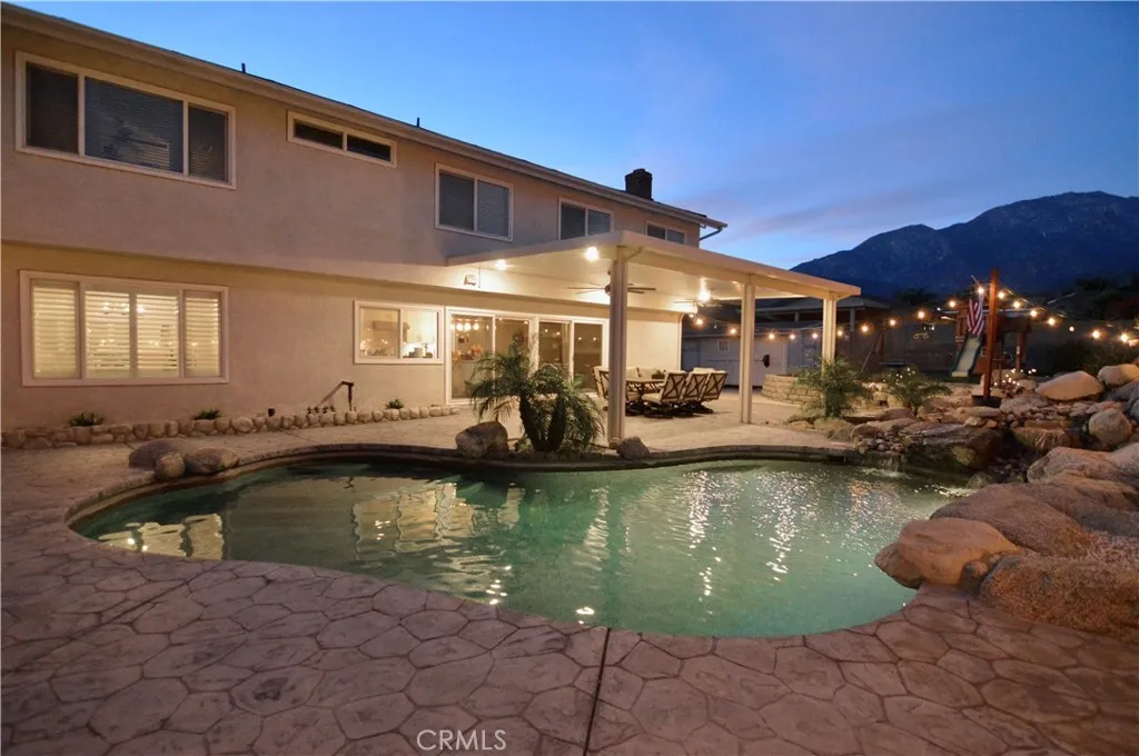 Welcome to this beautifully remodeled 4-bedroom, 3-bath home in the highly desirable Alta Loma areawhere elegant design meets resort-style outdoor living. From the moment you arrive, the professionally landscaped yard and charming flagstone porch set the tone for the exceptional living experience inside. Vaulted ceilings and dramatic south-facing architectural windows flood the home with natural light while maintaining privacy. The formal living and dining areas feature plantation shutters and flow into the expanded chef's kitchen, thoughtfully designed with abundant workspace, added storage, a professional 36" Monogram range, built-in Monogram microwave, Zephyr vent hood, recessed lighting, and a stylish island pendant. The inviting family room centers around a ledgestone fireplace and opens through two large sliding doors to a stunning backyard retreat. Enjoy a rock waterfall, solar-heated Pebble Tec pool, and an expansive covered patio with recessed lighting and dual ceiling fansperfect for year-round entertaining. A raised play area with play structure adds additional outdoor fun. Upstairs, the spacious primary suite offers an updated bathroom with a walk-in shower and walk-in closet. Three additional bedrooms feature mirrored closet doors, ceiling fans, and newer windows. The second floor also includes a laundry room and an updated bathroom with a stylish barn door. Additional highlights include a newer roof, finished 3-car garage with overhead storage access, large gated RV parking, a spacious storage shed, room for multiple recreational vehicles, and a newer roof. Co