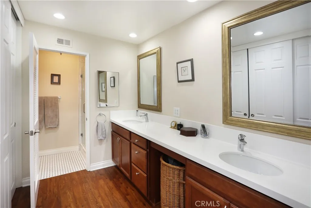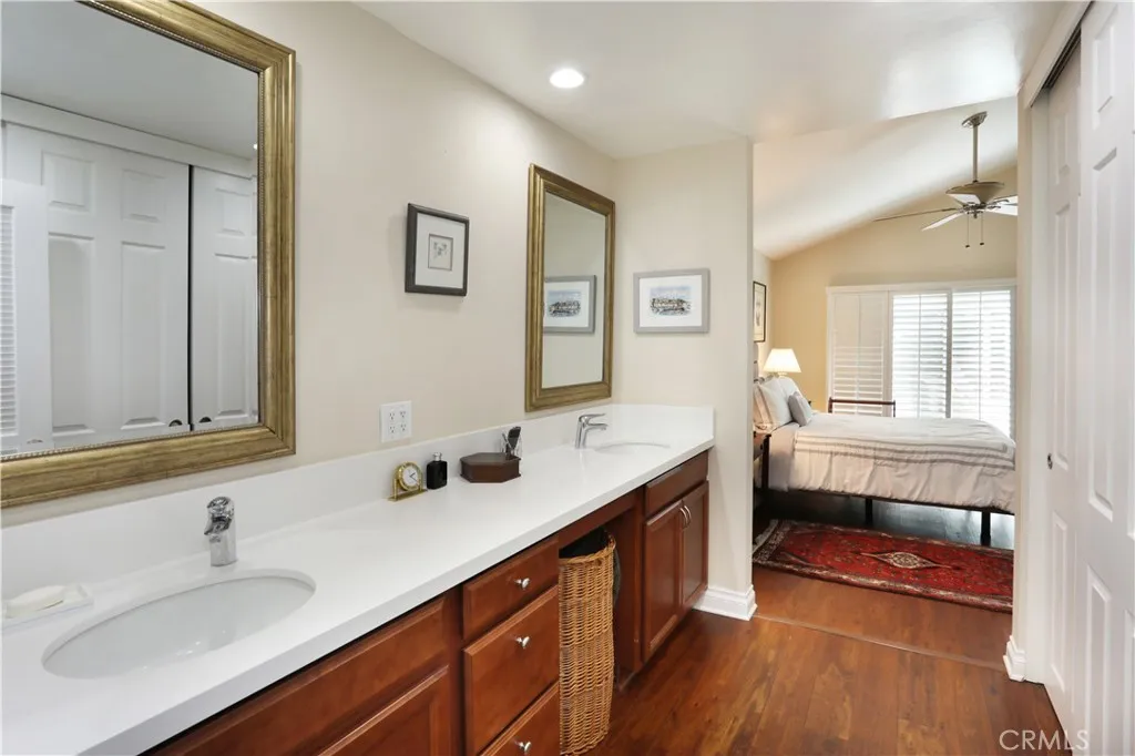 Beautifully remodeled SINGLE-STORY home featuring two spacious bedrooms, an open living and dining area with elegant plantation shutters throughout. Soaring high ceilings create an open, airy feel, complemented by gorgeous wood laminate flooring. An upgraded kitchen and primary bath showcase stunning quartz countertops, blending style and functionality. Premium stainless steel appliances include a Fisher & Paykel DishDrawer dishwasher, LG refrigerator, GE built-in microwave, and a 5-burner gas stoveperfect for everyday living and entertaining. This desirable end unit offers added privacy and a peaceful patio overlooking the hillside, providing a serene outdoor retreat. Add on the community features such as the pool, spa and clubhouse and you're getting the complete package.