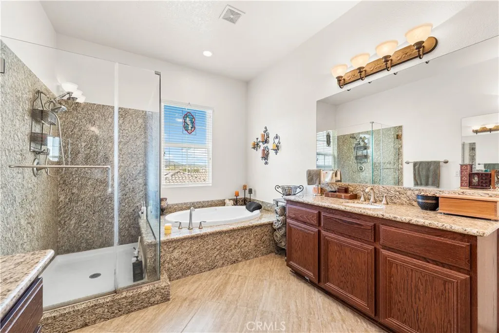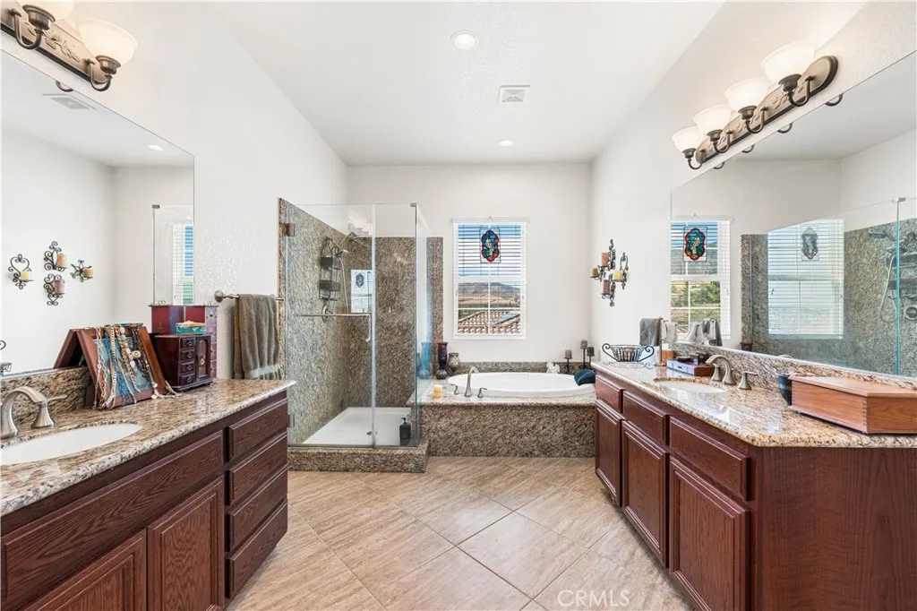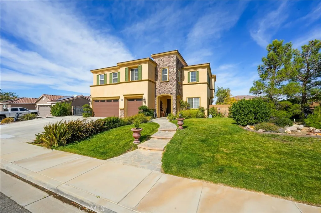 This one-of-a-kind former model home, offered by the original owner, sits in one of the Antelope Valley's most desirable neighborhoods and is zoned for Quartz Hill High. Featuring 3,909 sq. ft. plus a 350 sq. ft. ADU, this home offers flexibility for multi-generational living or an income opportunity. Highlights include a butler's pantry, formal living and dining rooms with soaring 25+ ft ceilings, and a secondary master suite downstairs with a full bath and walk-in closet. Upstairs, the primary suite opens to a walkout patio capturing stunning 300-degree views of the valley, Tehachapi range, and beyond. Enjoy a spacious game room with bar and library, a full outdoor kitchen, fireplace, fire ring, koi pond, and three large seating areasperfect for entertaining. Energy-efficient with 5,500W of paid solar, dual tankless water heaters, two 5-ton A/C units, and 2x6 exterior walls. True RV access, block walls, and room for a pool complete this exceptional home.